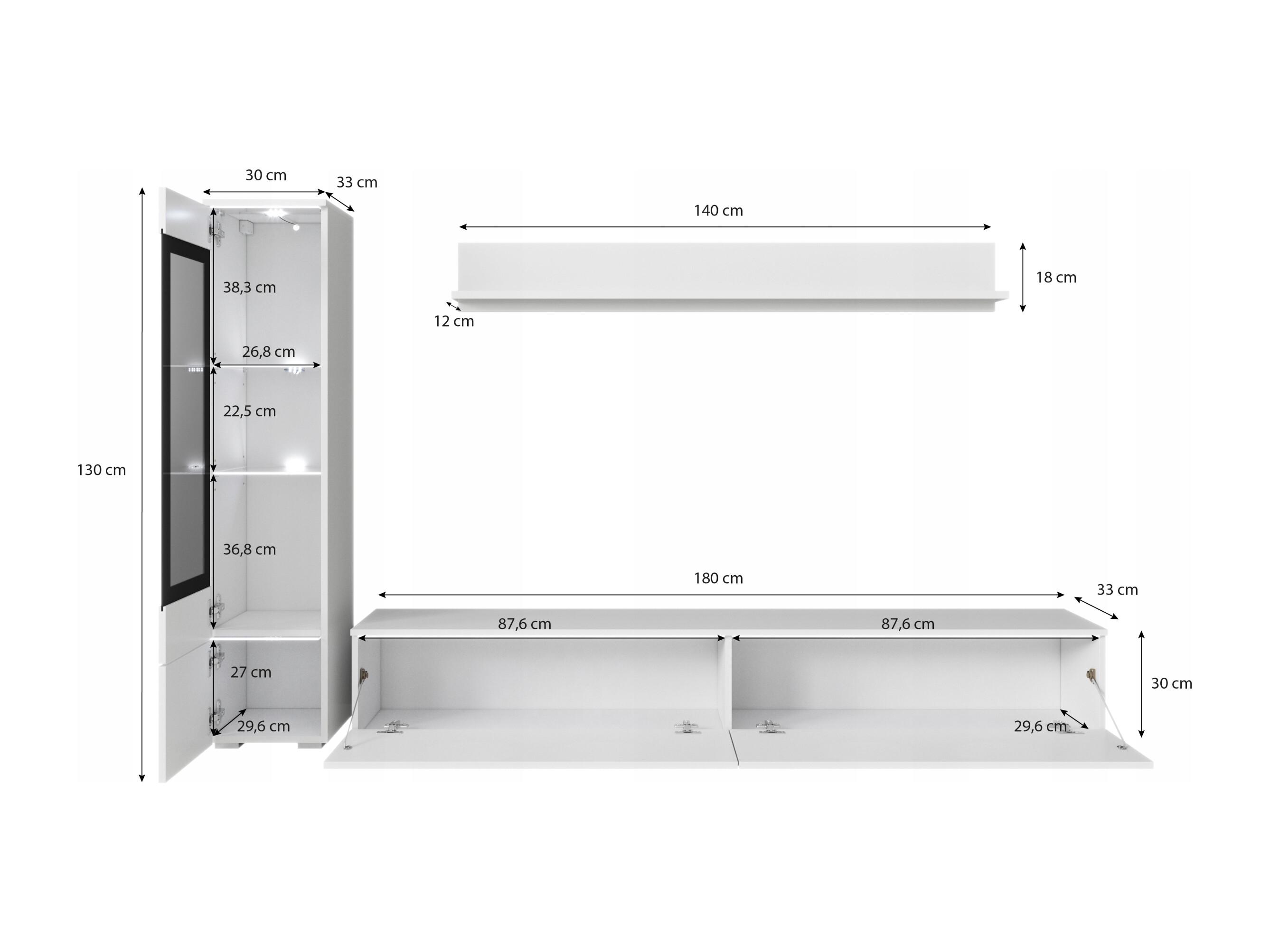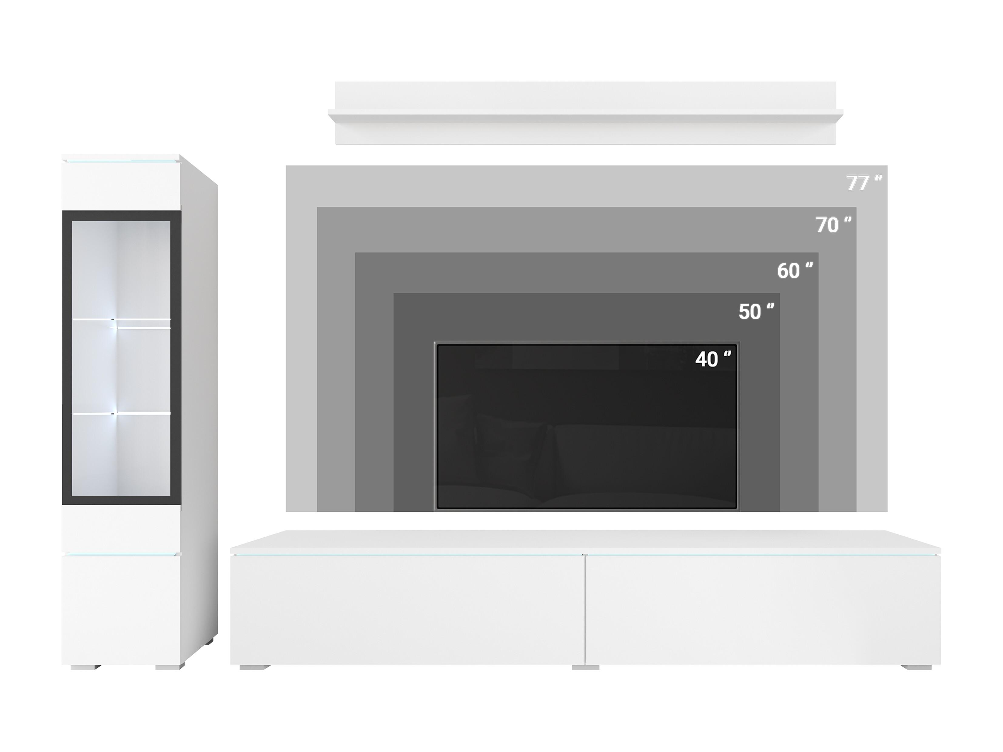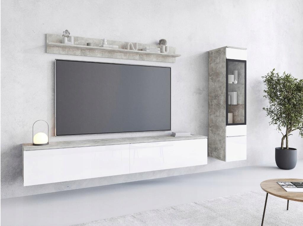 Ensemble moderne de meubles de salon 3 éléments – meuble TV 180 cm, vitrine et étagère, corps béton mat, façades blanc brillant, autoportant ou suspendu