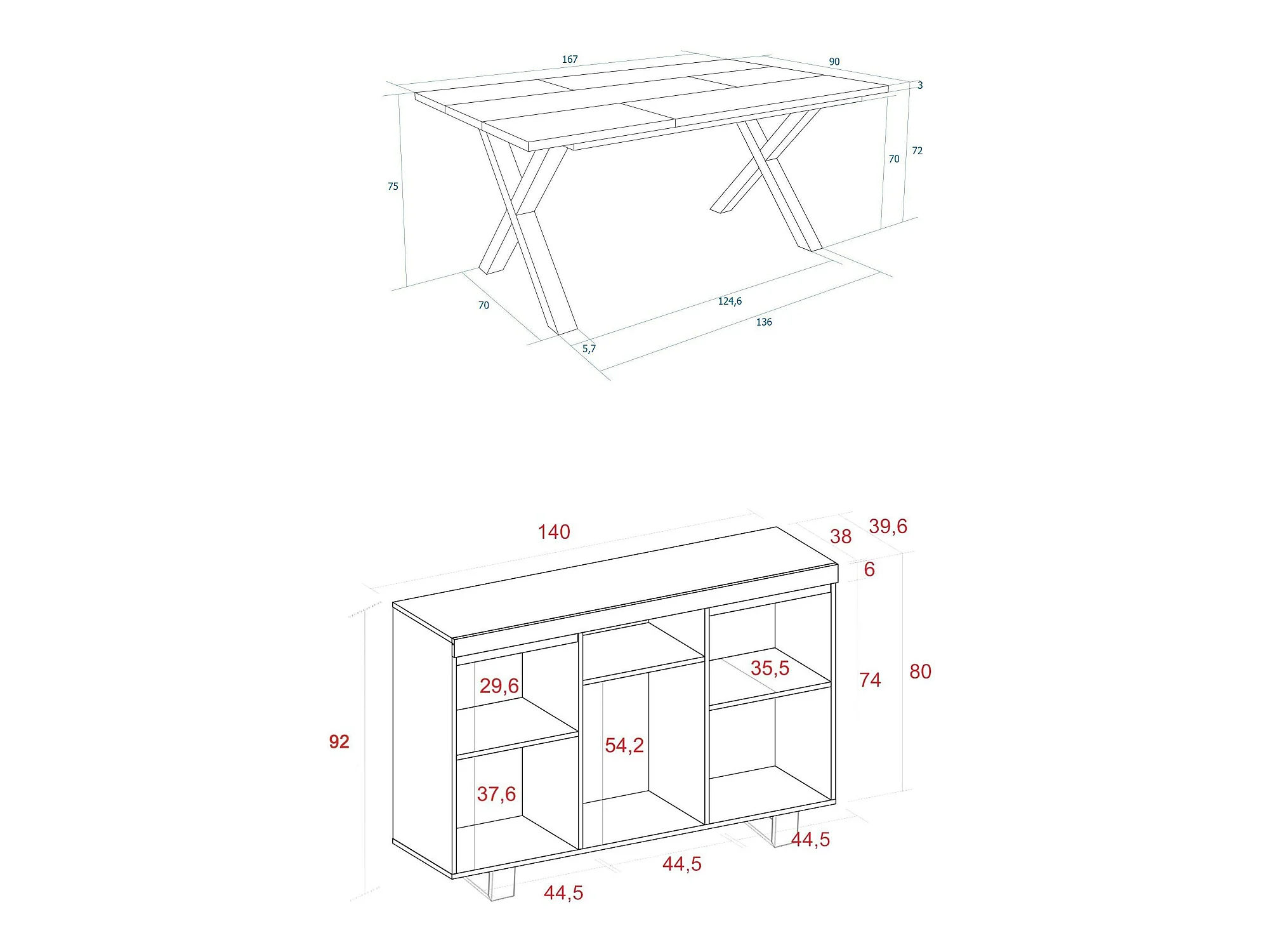 Ensemble de meubles de salon, Table 170 Bicolore pieds X 8 convives, Crédence / Buffet 140 Tall, Chêne et Noir, Style Industriel