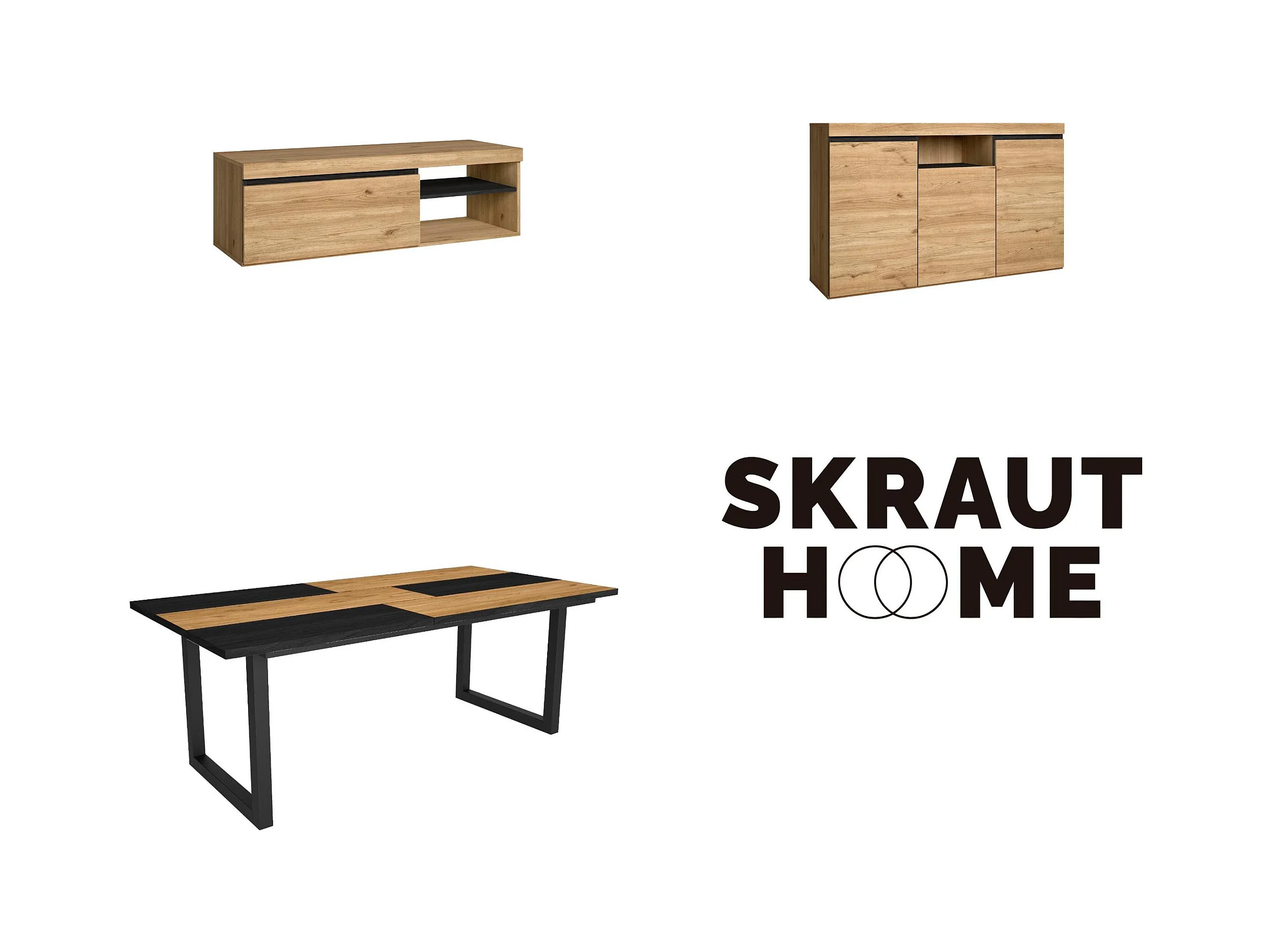 Ensemble de meubles de salon, Table 200 Bicolore pieds U 10 convives, Meuble TV 120, Crédence / Buffet 140, Chêne, Noir, industriel