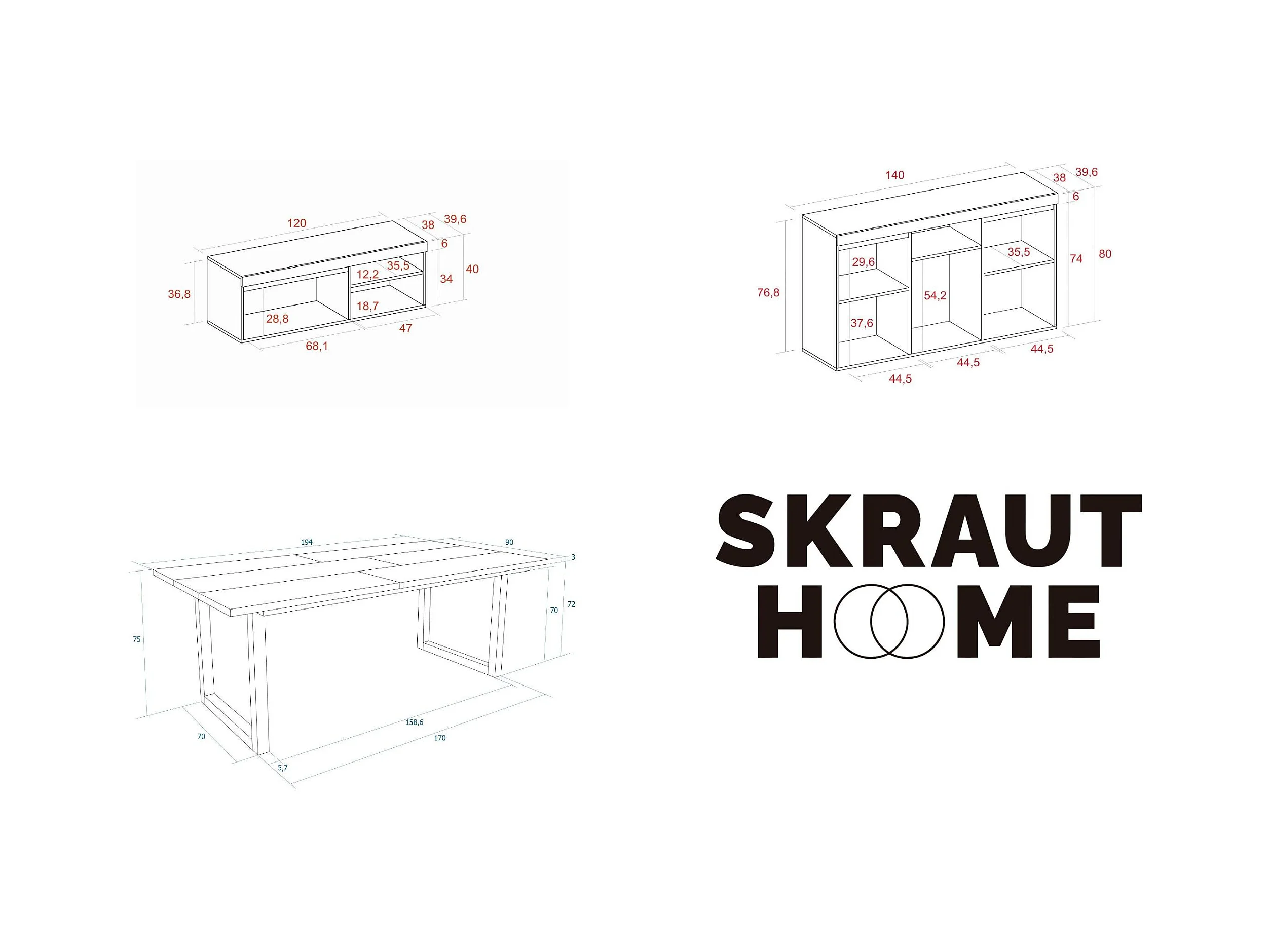 Ensemble de meubles de salon, Table 200 Bicolore pieds X 10 convives, Meuble TV 120, Crédence / Buffet 140, Chêne, Noir, industriel