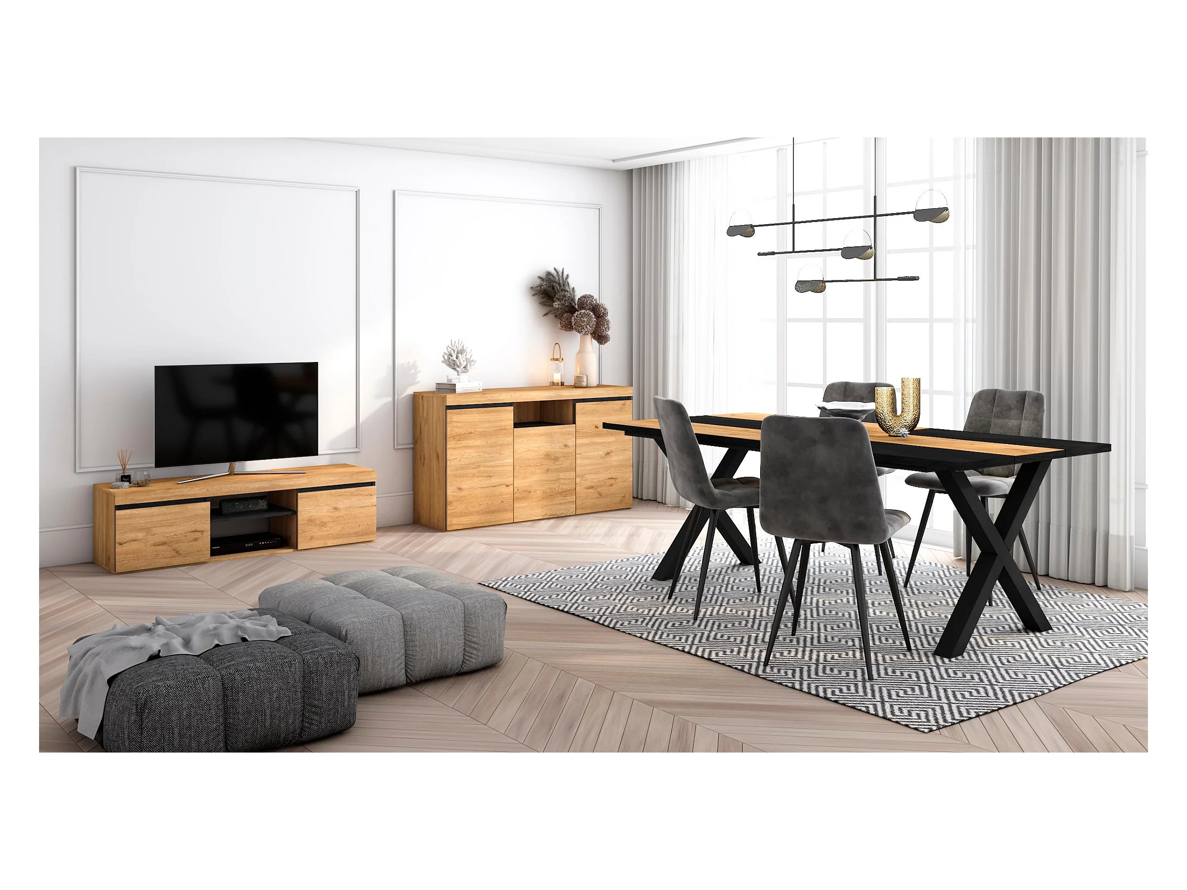 Ensemble de meubles de salon, Table 200 Noire pieds X 10 convives, Meuble TV 160, Crédence / Buffet 140, Chêne et Noir, Industriel