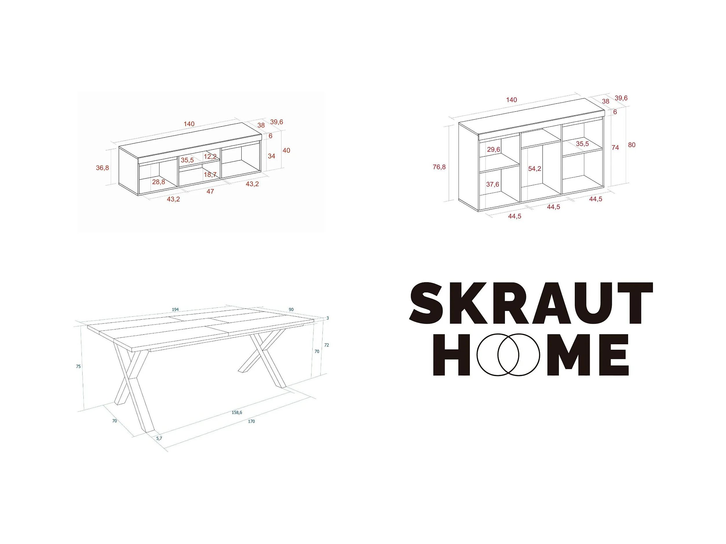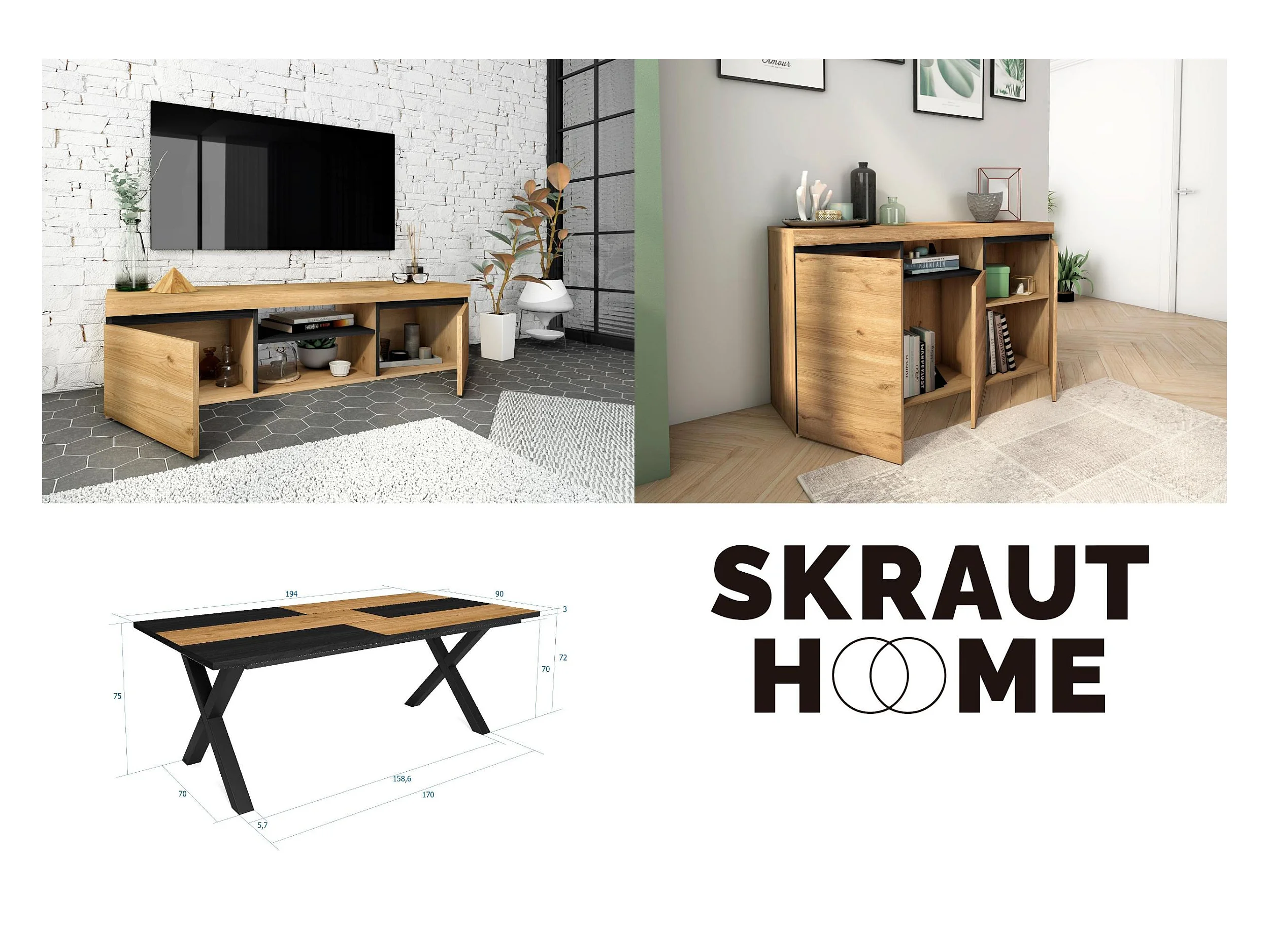 Ensemble de meubles de salon, Table 200 Bicolore pieds X 10 convives, Meuble TV 120, Crédence / Buffet 140, Chêne, Noir, industriel