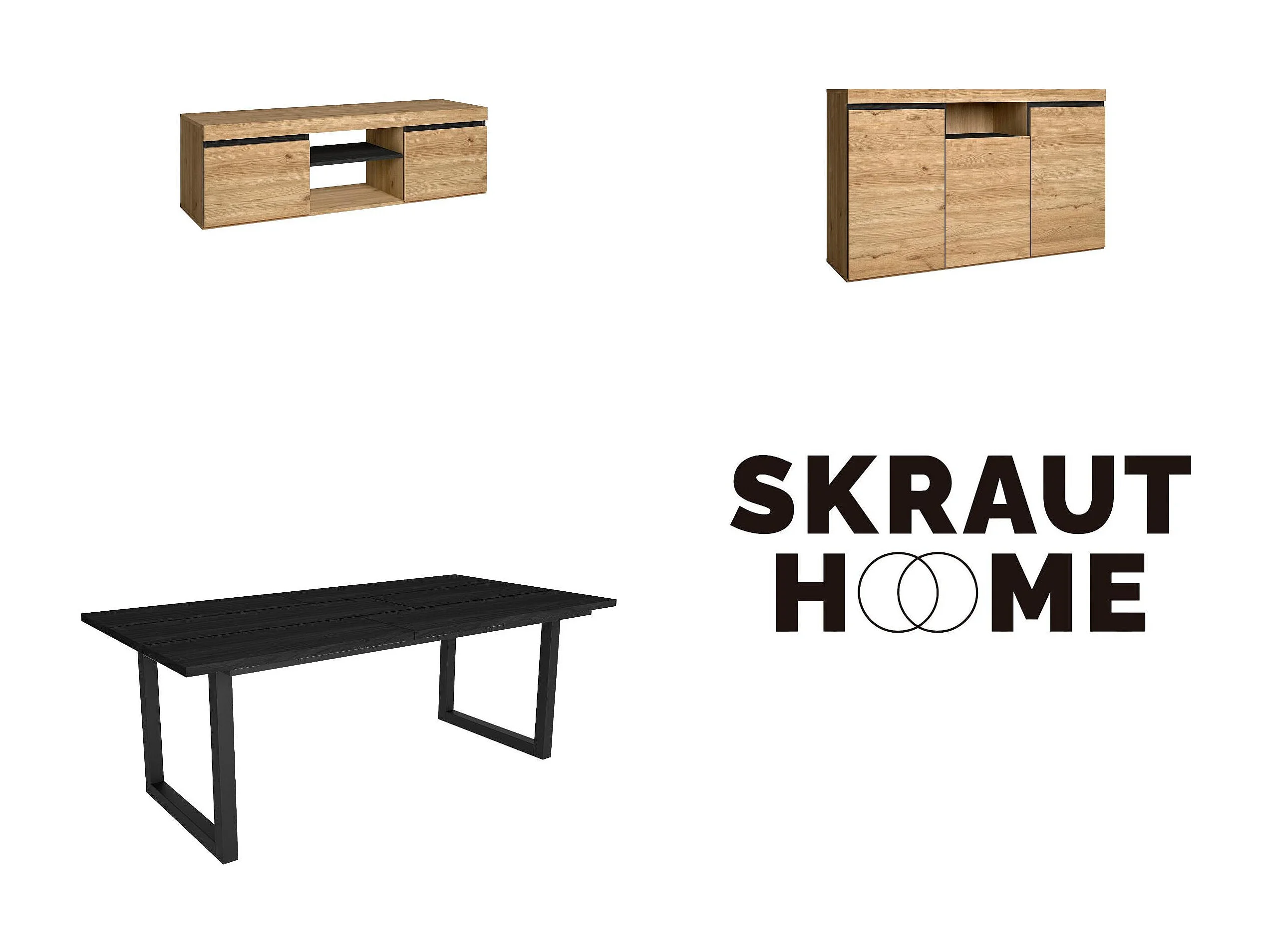 Ensemble de meubles de salon, Table 200 Front Noir pieds U 10 convives, Meuble TV120, Crédence / Buffet 140, Chêne Noir, Industriel