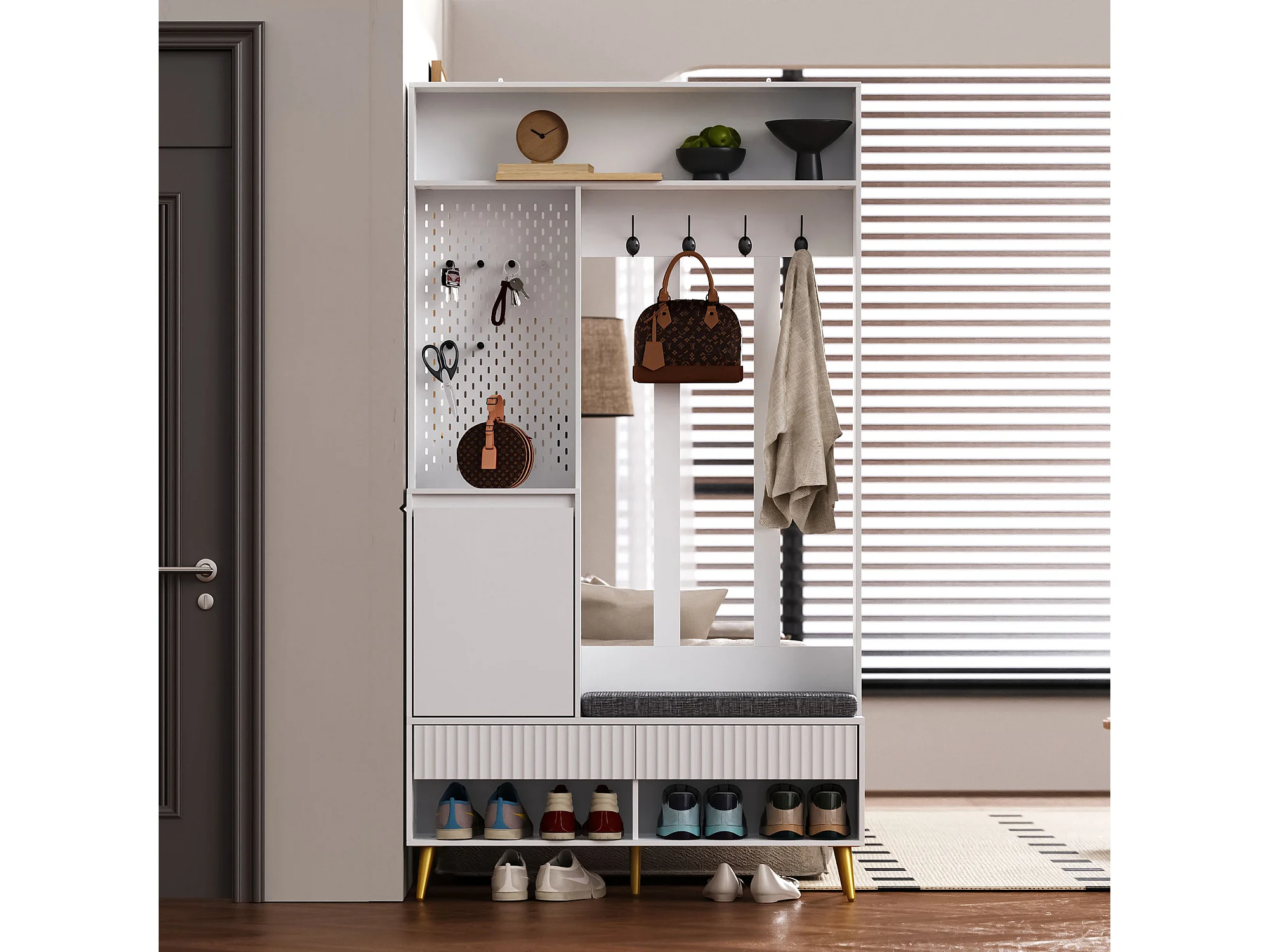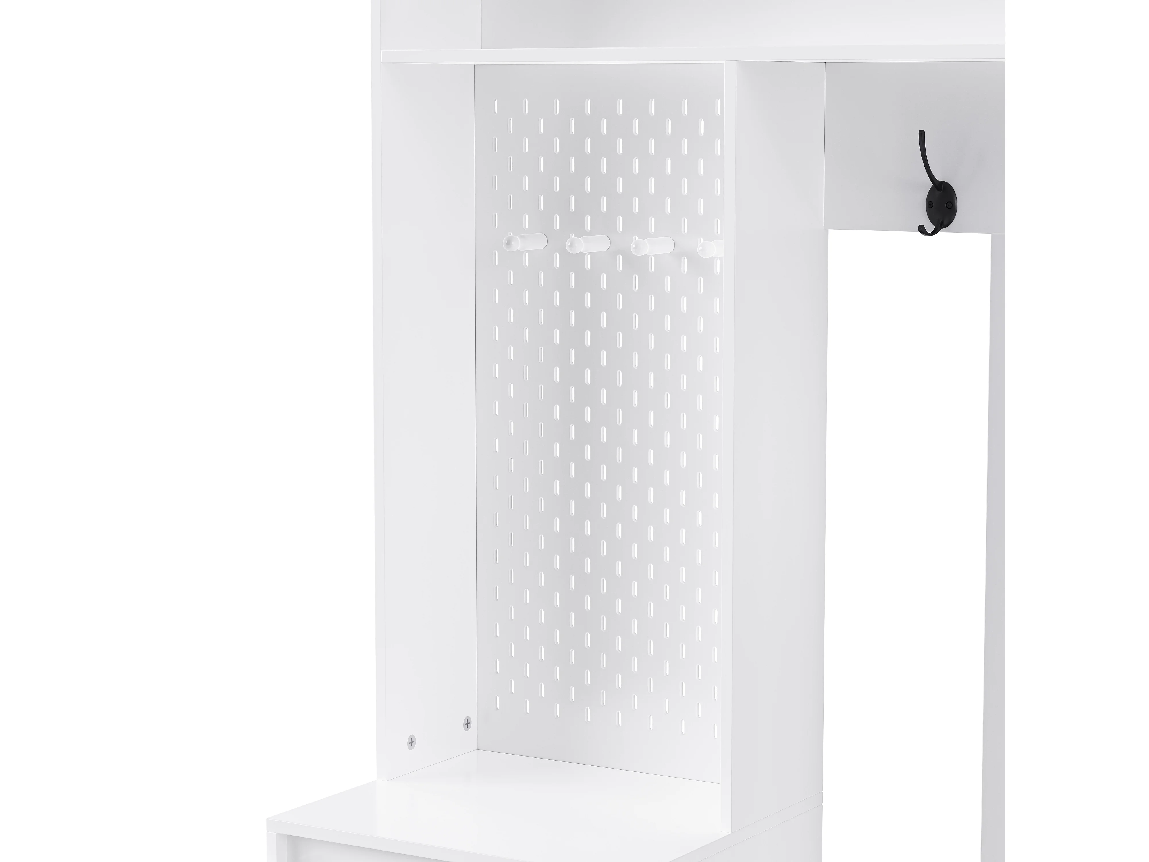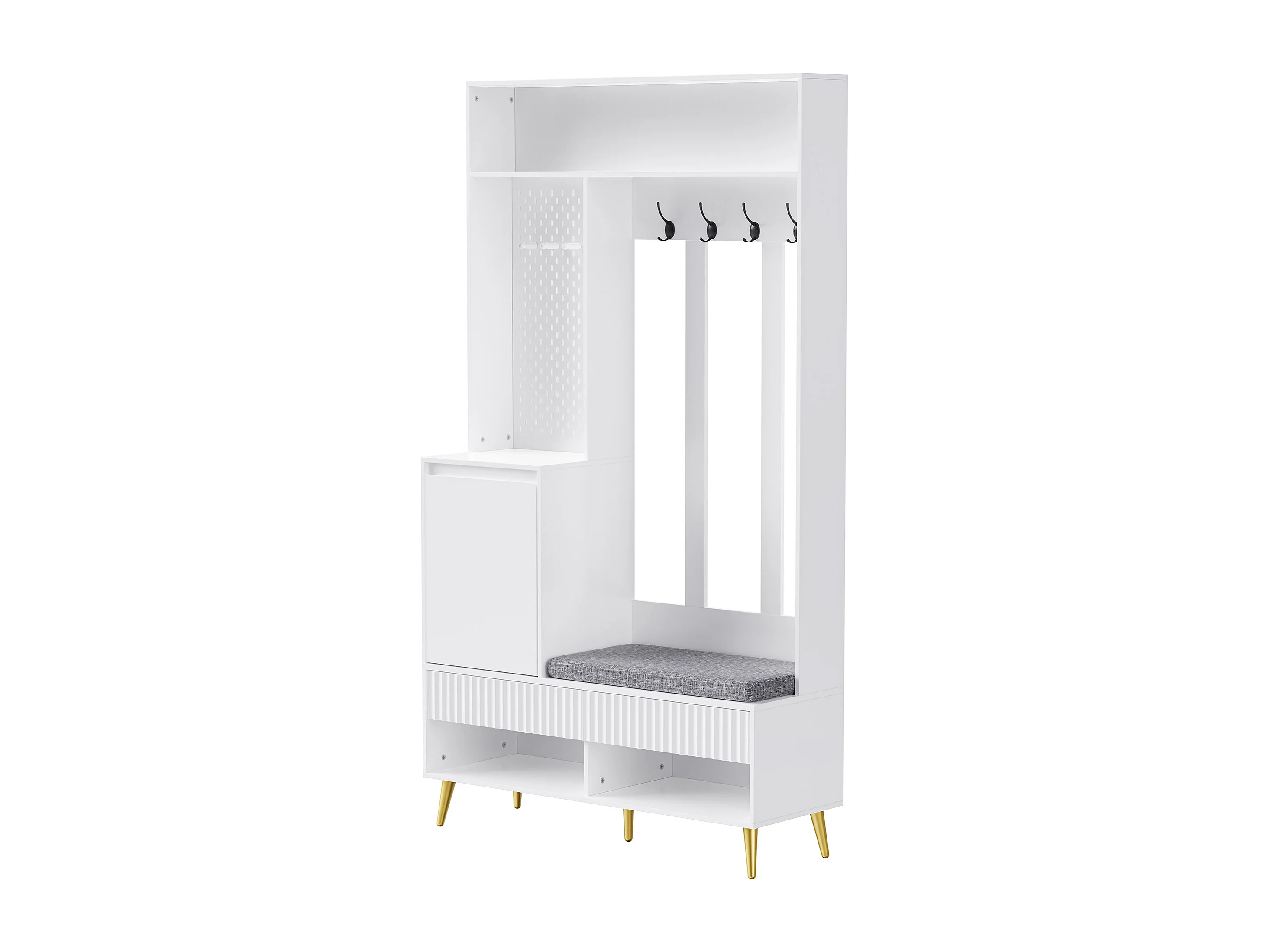 Meuble d'entrée 100x35x180 cm, 6 en 1 avec banc coussiné et panneau perforé, 4 crochets, MDF blanc