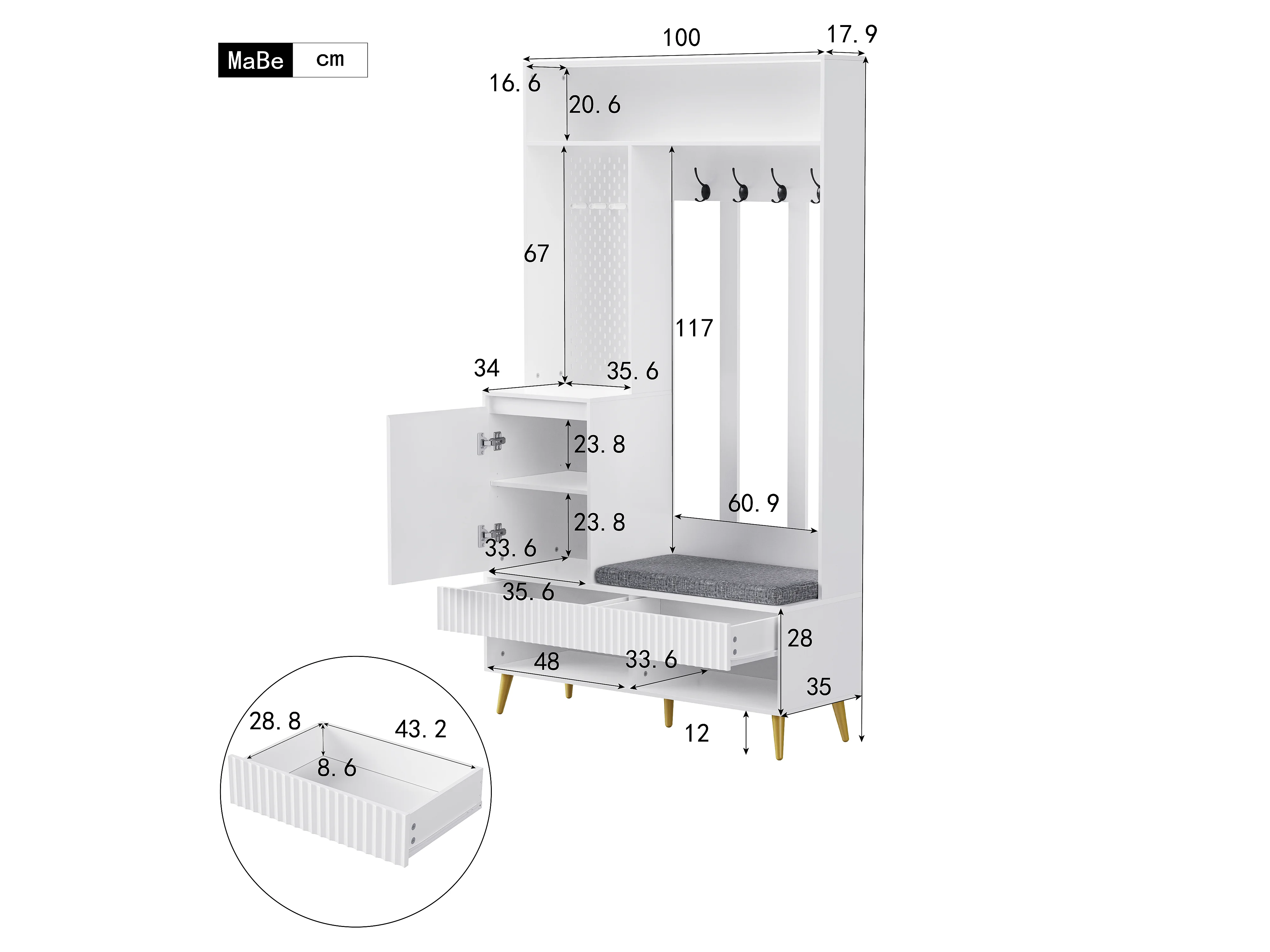 Vestiaire d'entrée 100x35x180 cm, 4 crochets, 2 tiroirs, 1 porte, banc avec coussin, MDF blanc