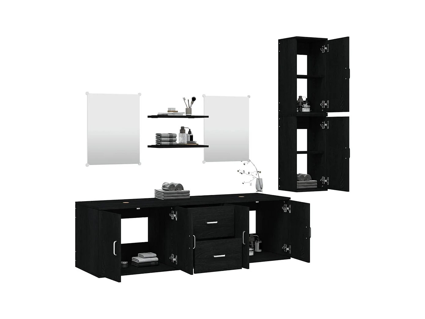 Ensemble meuble double vasque 140cm 2 niches miroirs LED colonne et 3 armoires murales Gaia Bois et Noir - Vasque Noir