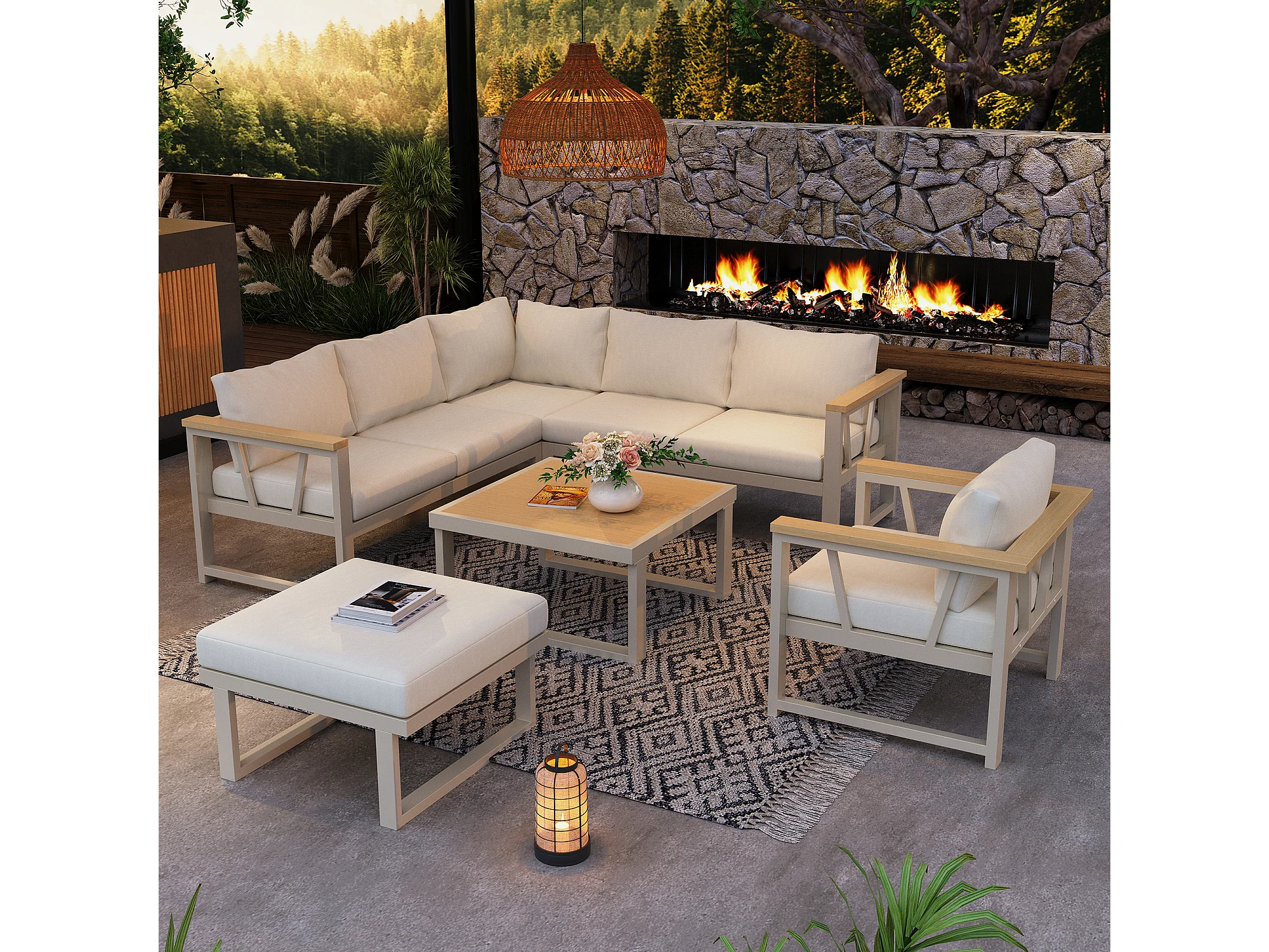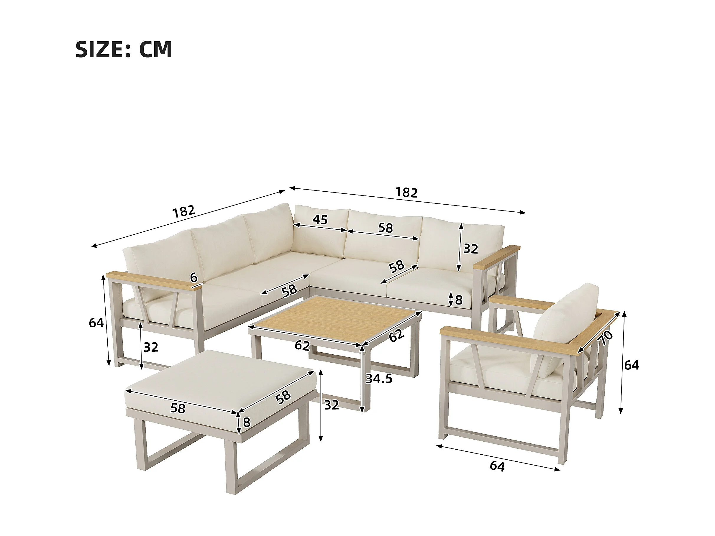 Ensemble de mobilier de jardin d'angle 7 places - avec 1 chaise + repose-pieds + table - Polyester + métal - kaki