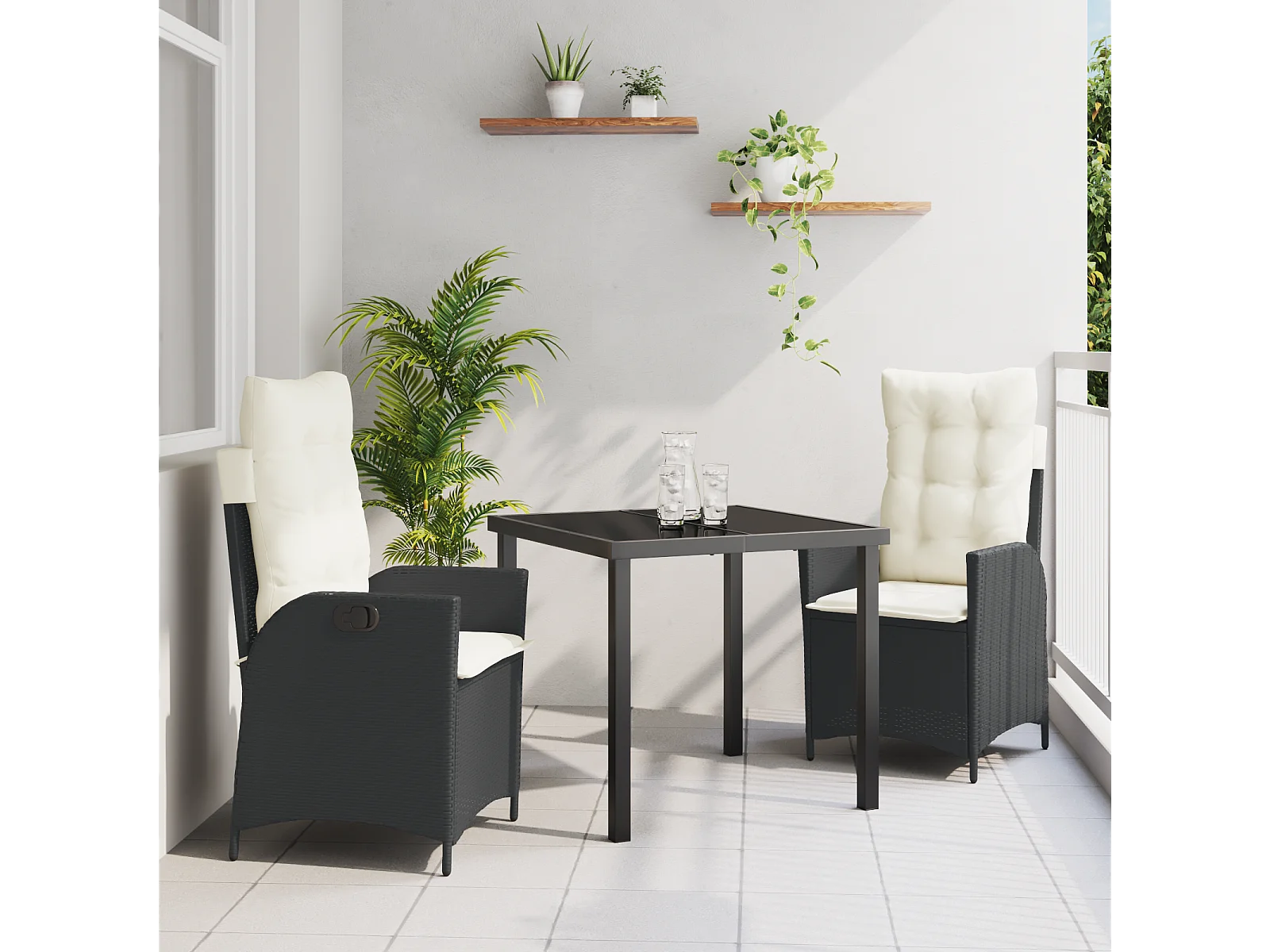 Ensemble de salle à manger de jardin 3 pièces avec coussins en rattan poly noir