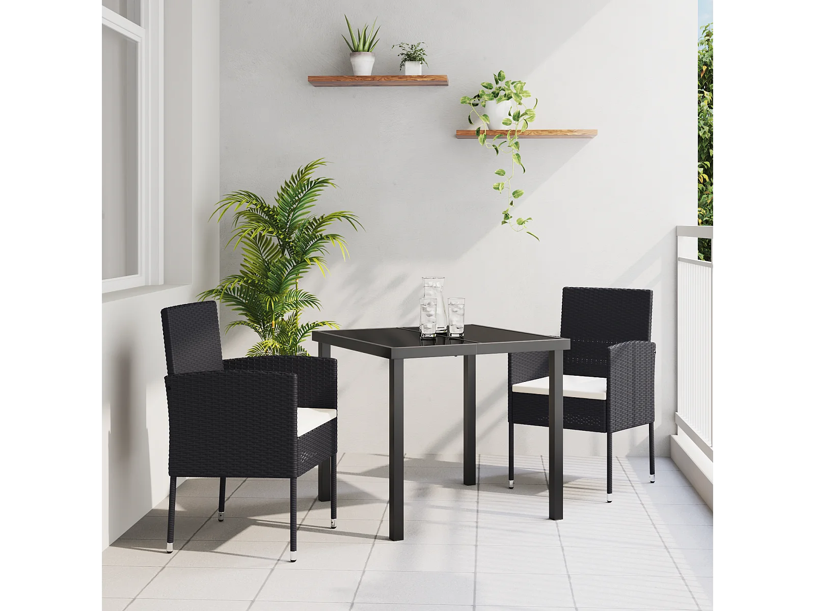 Ensemble de salle à manger de jardin 3 pièces avec coussins - Poly rotin noir
