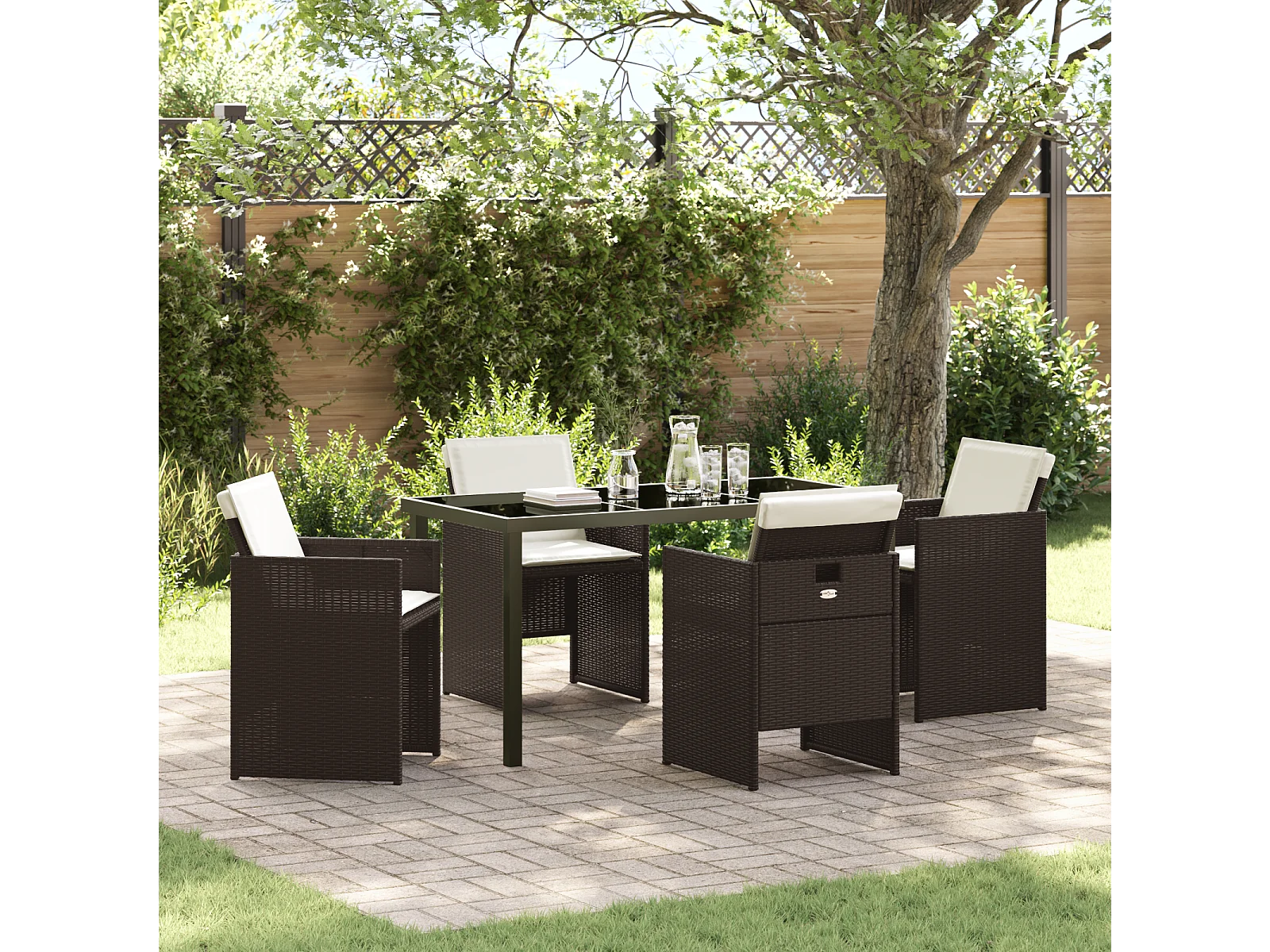 Ensemble de salle à manger de jardin 5 pièces avec coussins en poly rattan marron