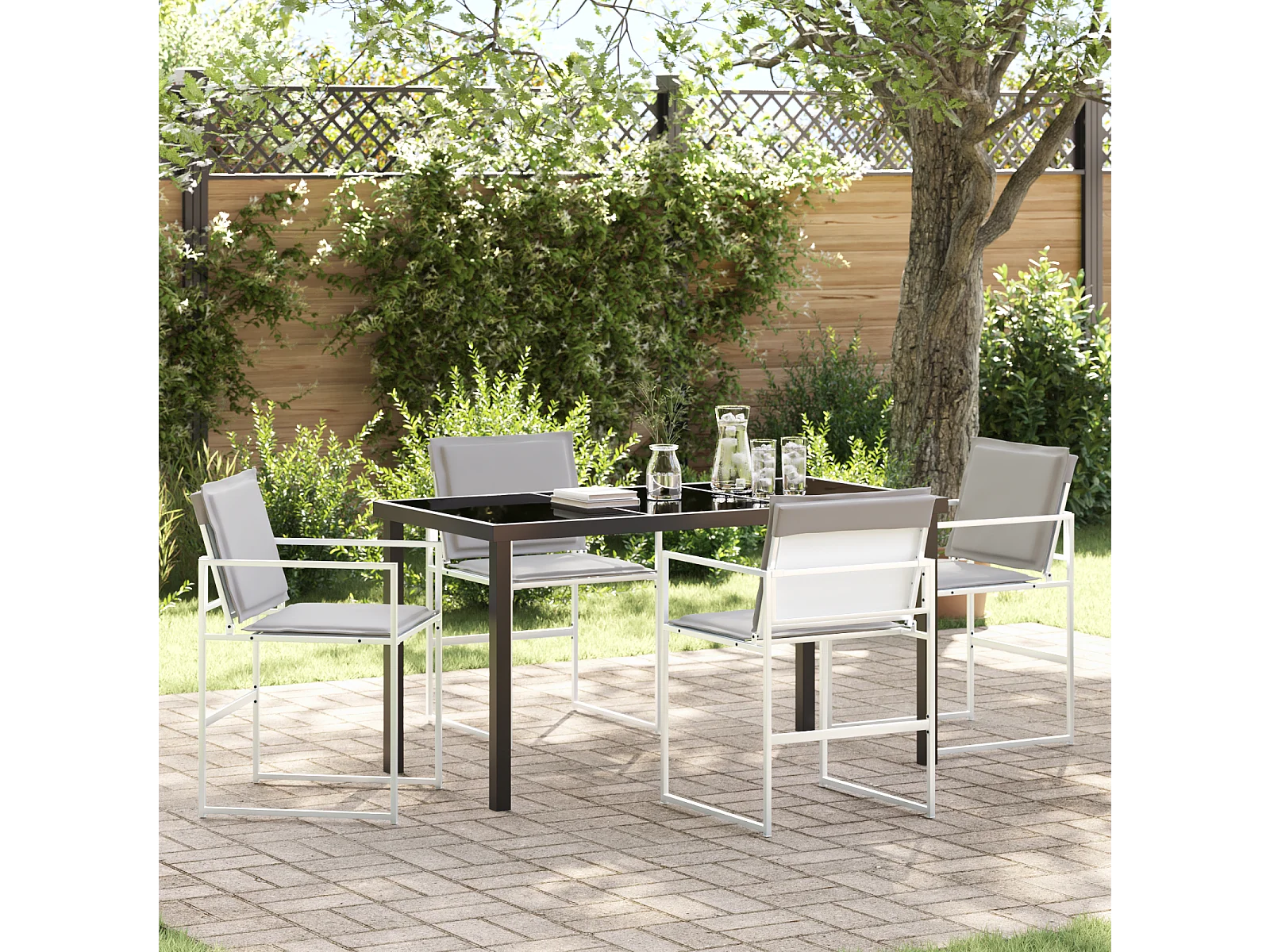 Ensemble de salle à manger de jardin de 5 pièces avec coussins blancs en Textilène et acier