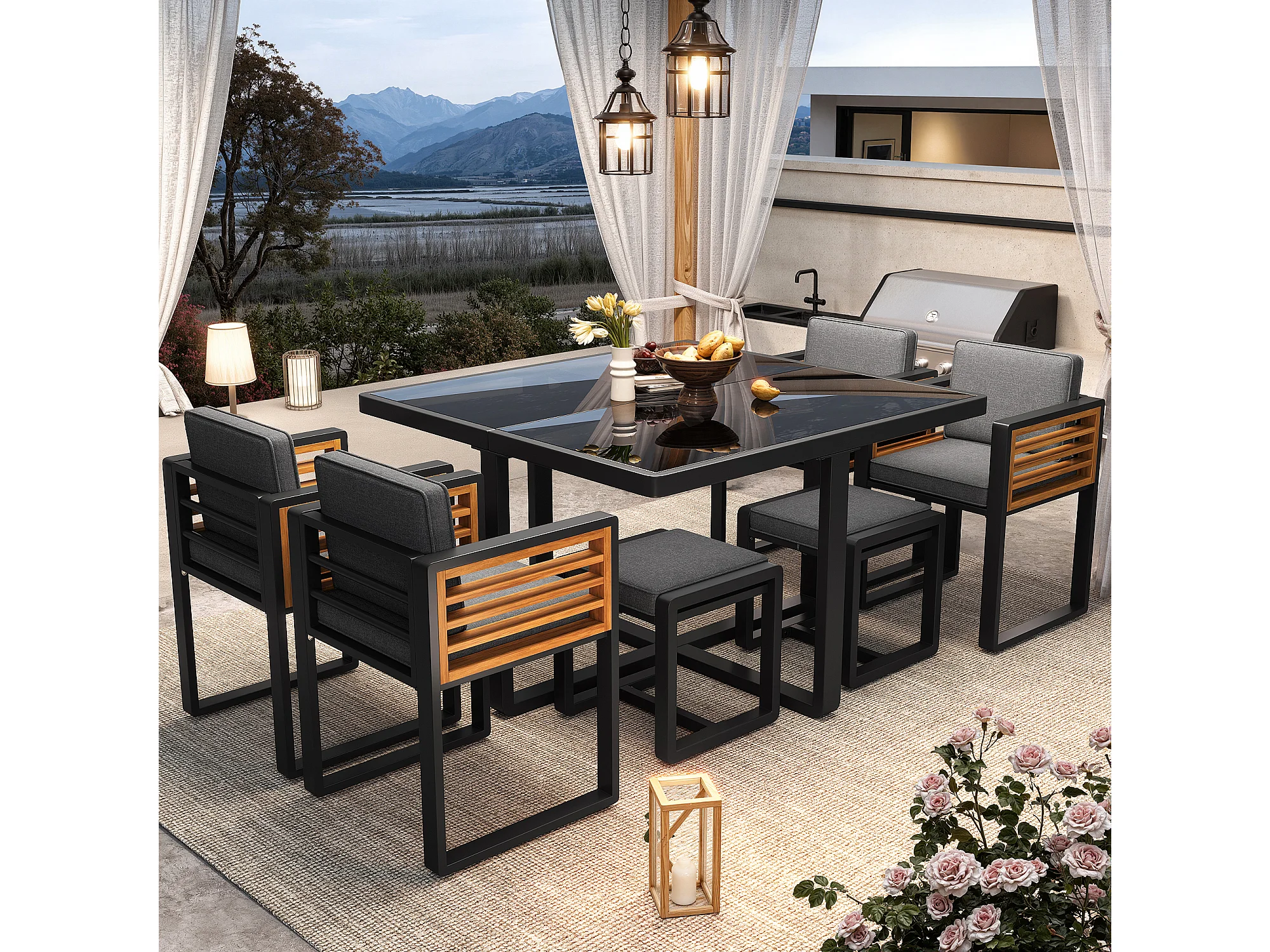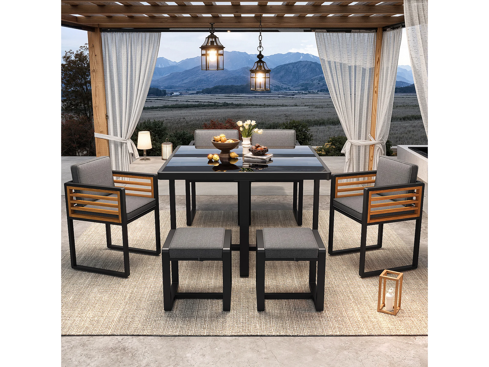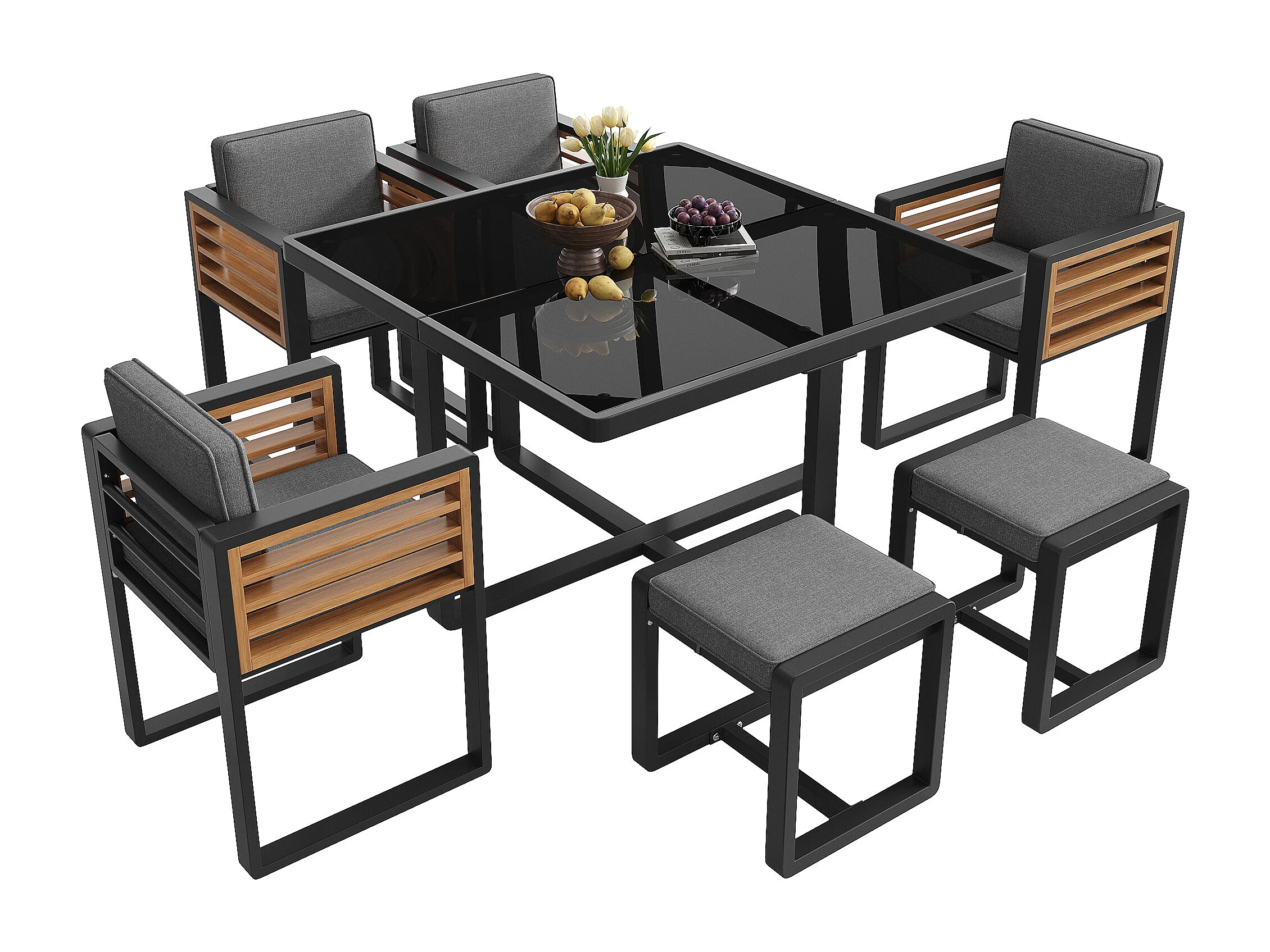 Ensemble de salle à manger de jardin pour 4-6 places, 1 tables à manger avec plateau en verre, en fer galvanisé, 4 fauteuils, 2 tabourets, gris