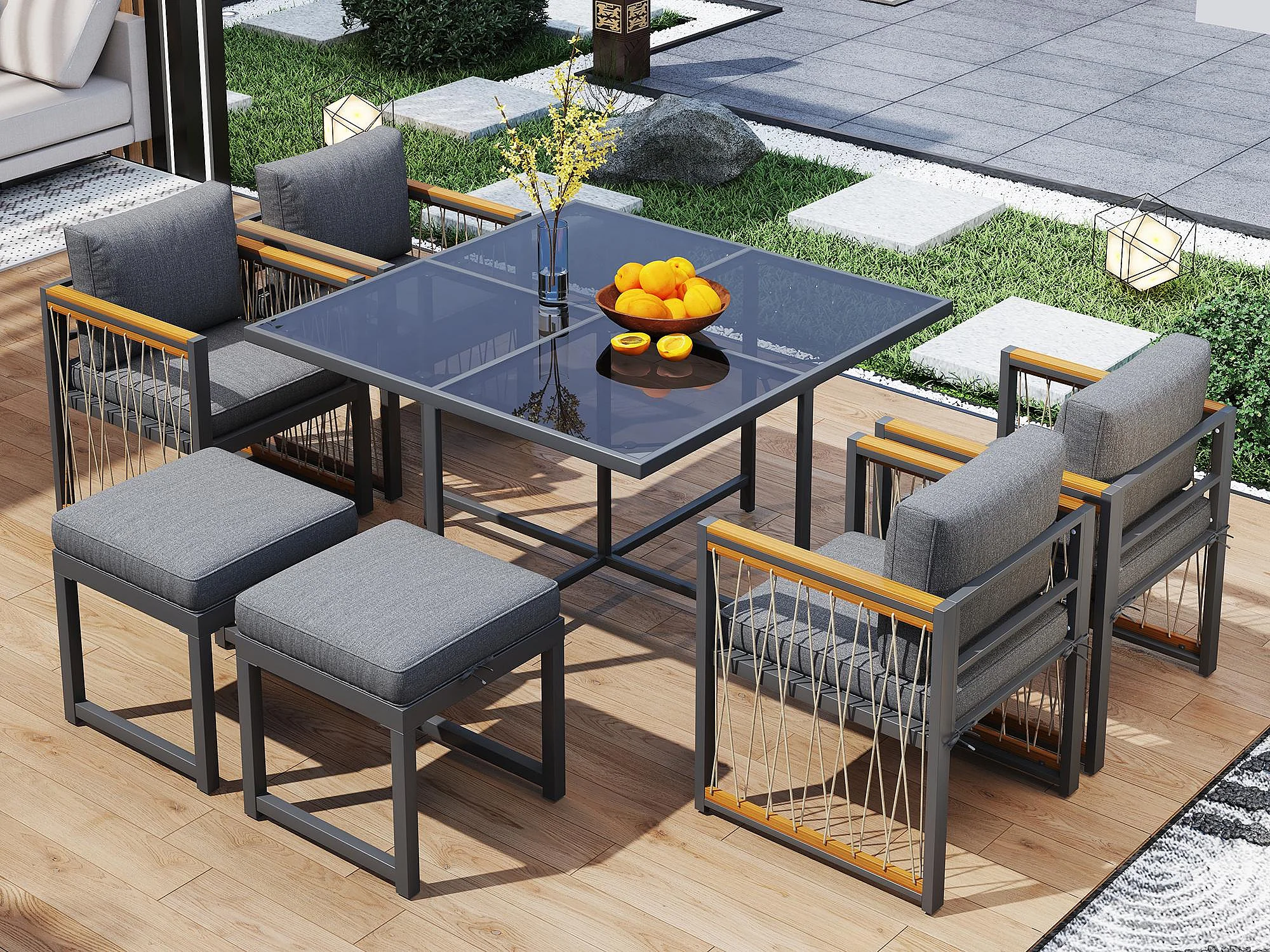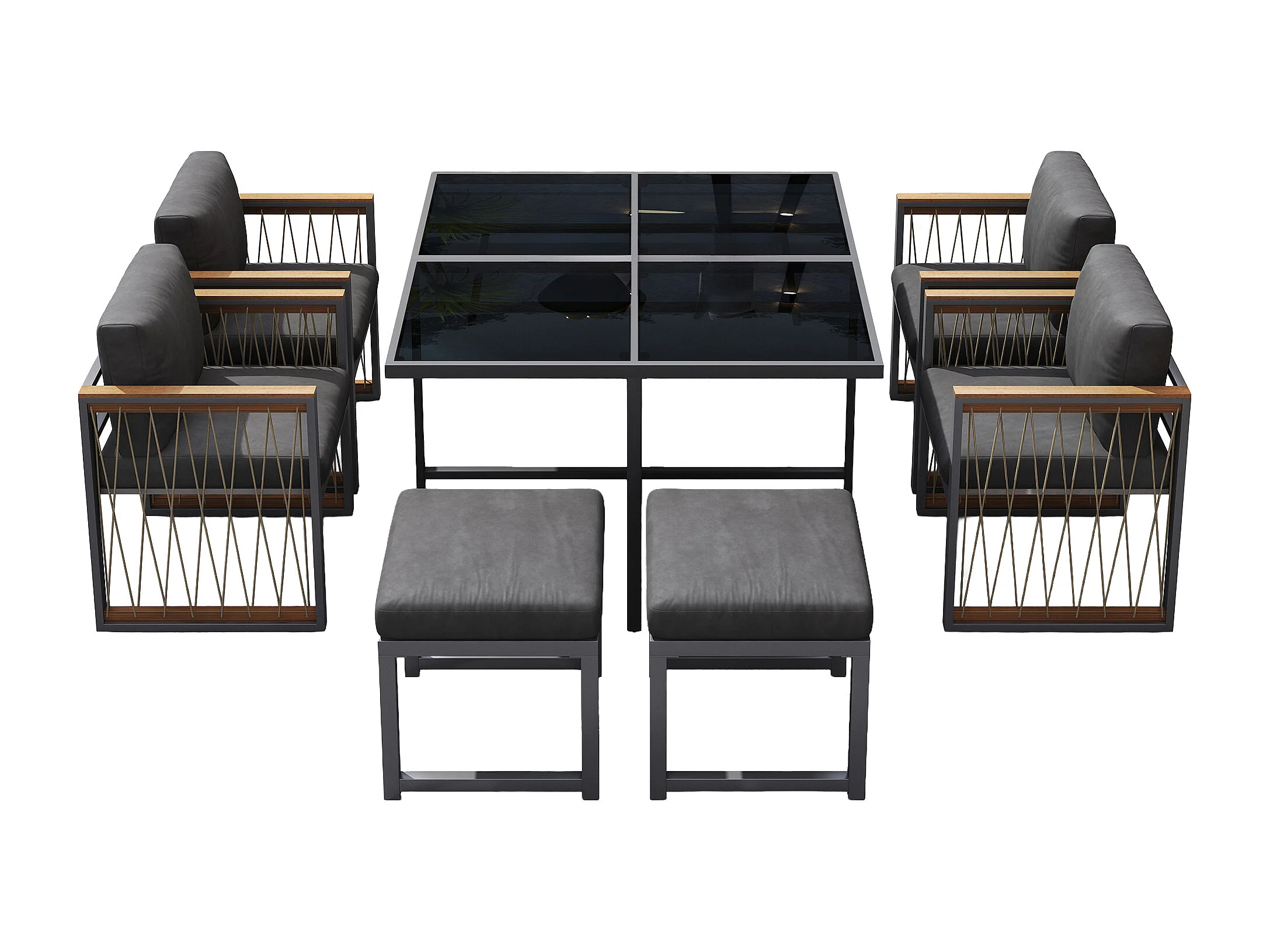 Ensemble de salle à manger de jardin pour 6 personnes, table en verre trempé, structure en fer galvanisé, 4 chaises, 2 tabourets, 1 table, gris