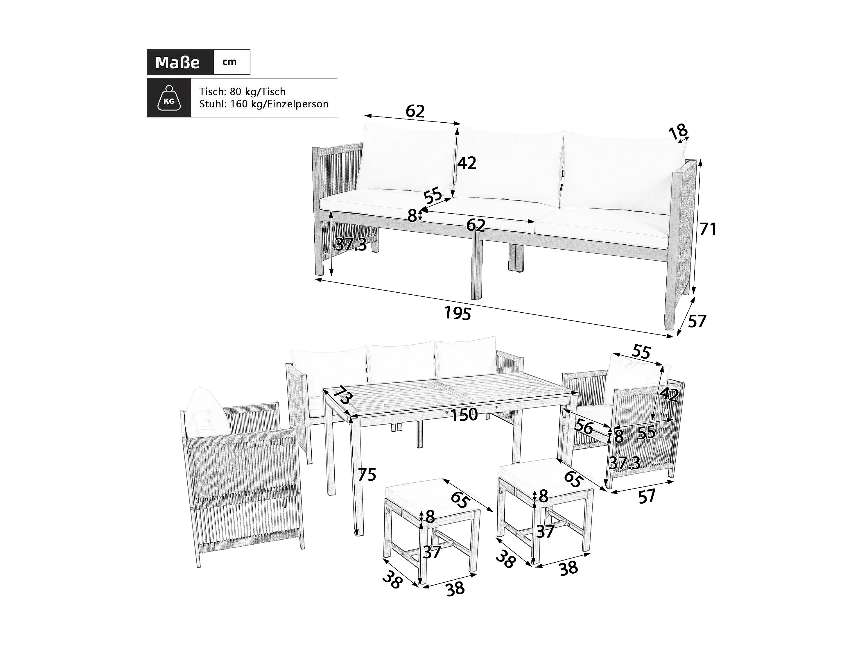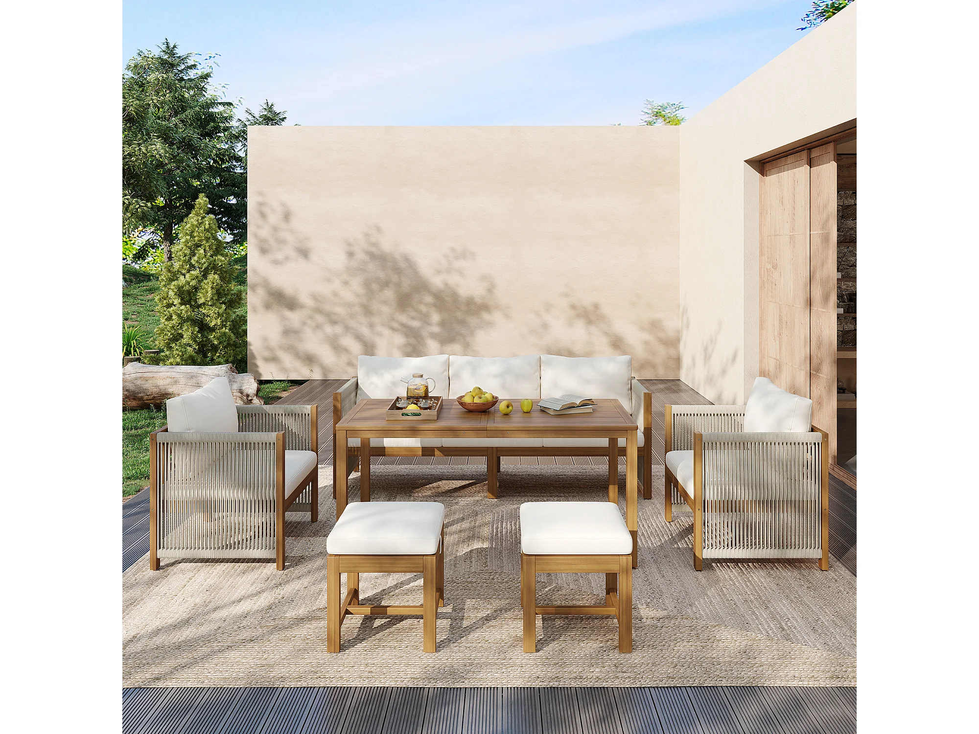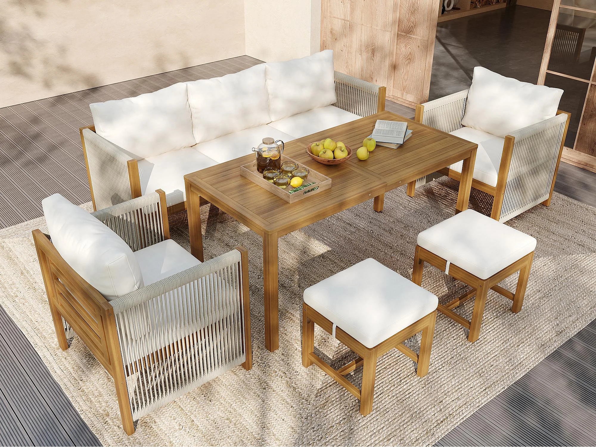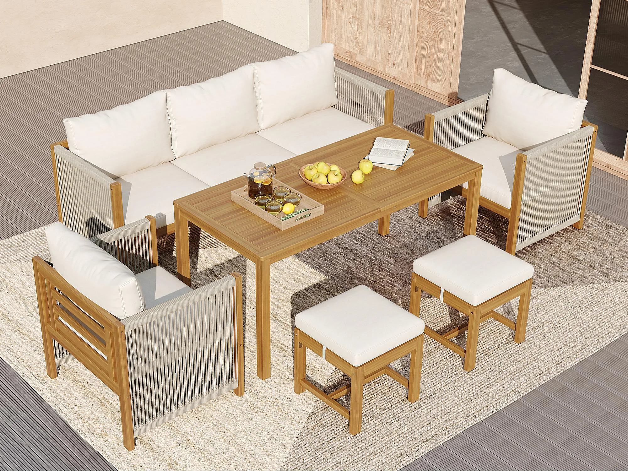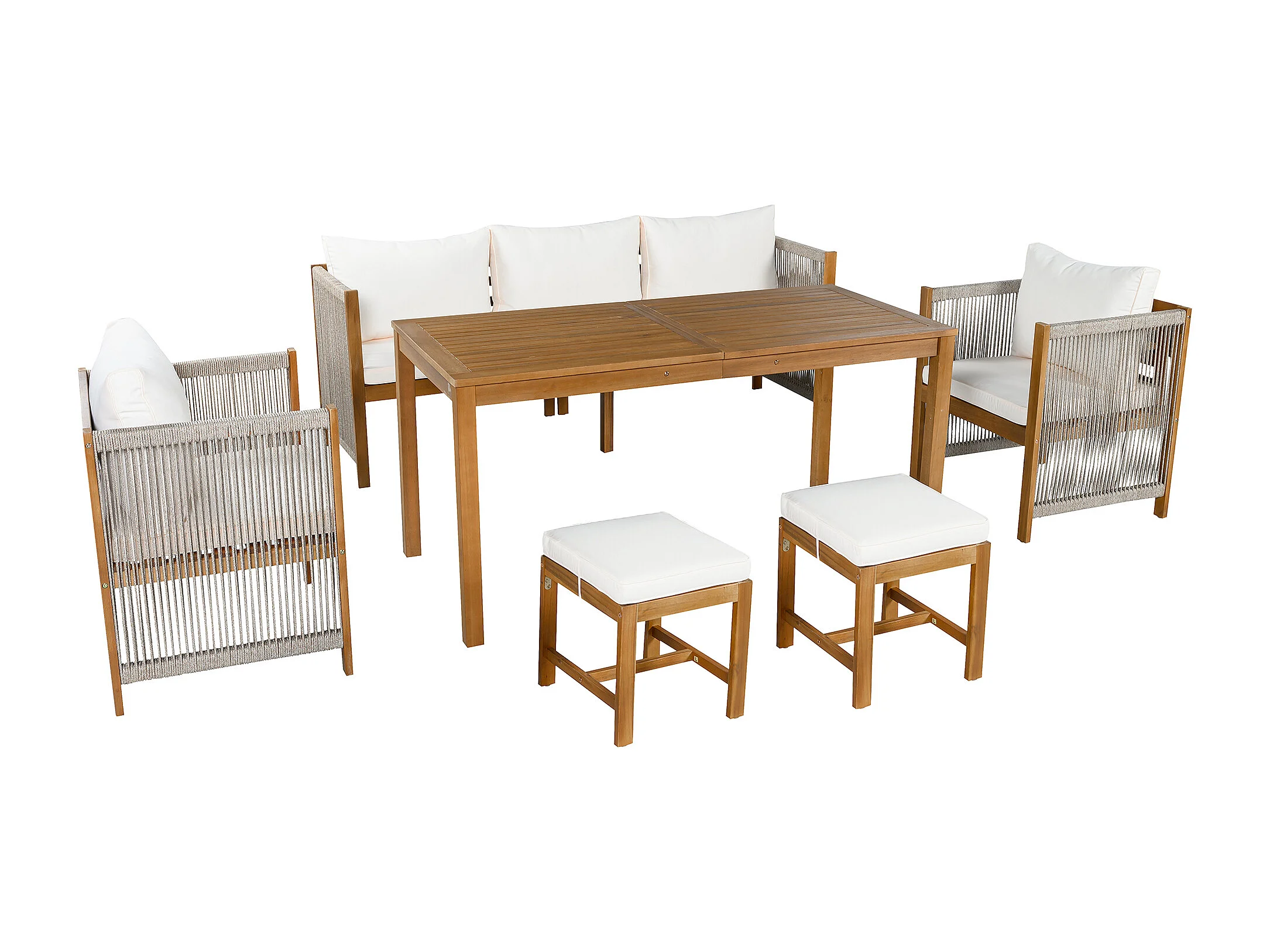 Ensemble de salle à manger de jardin pour 7 places, canapé, 2 canapés simples, 2 tabourets, table à manger, plateau en acacia, acier galvanisé, Beige