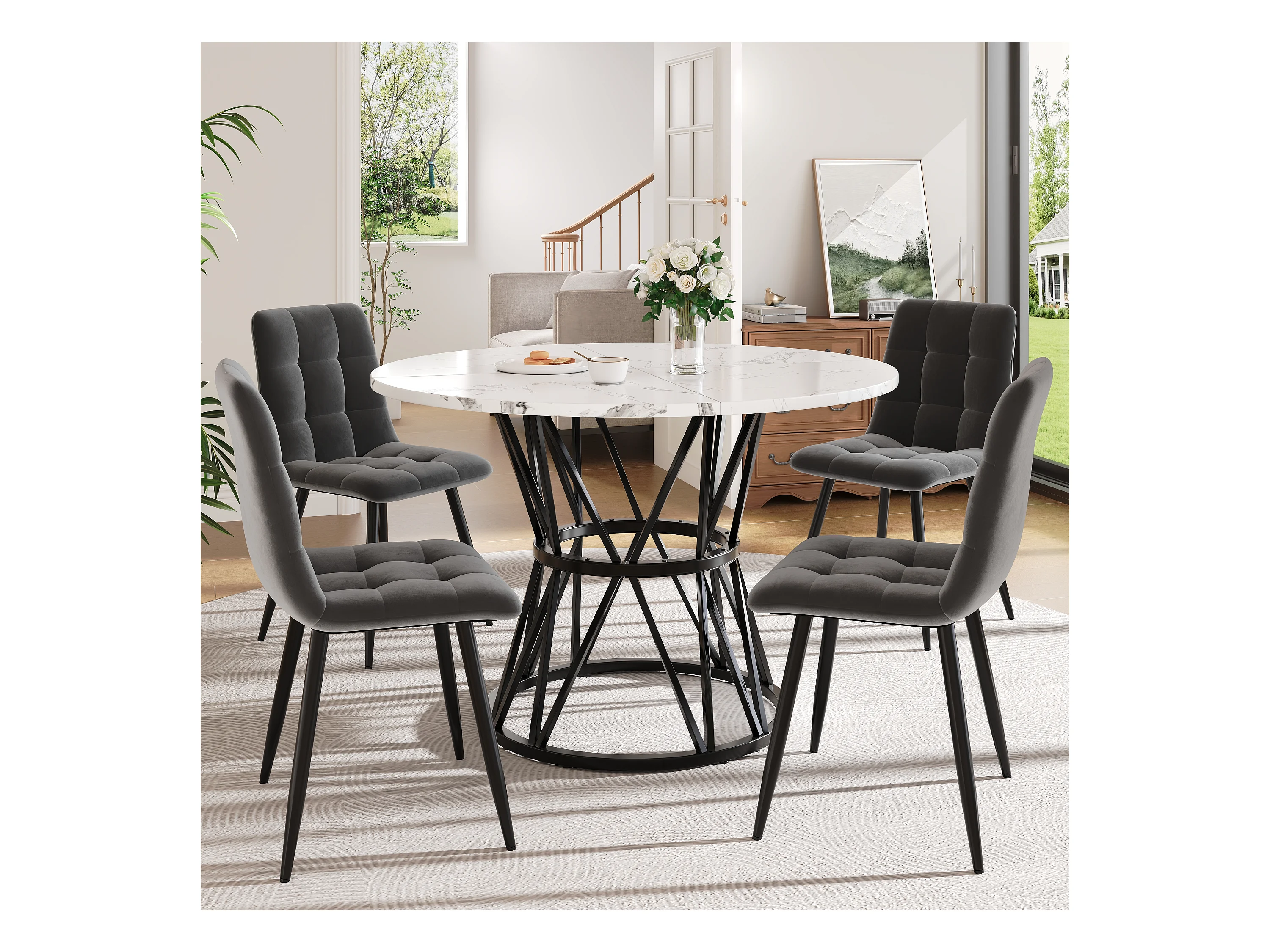 Ensemble de table à manger rond moderne, 4 chaises en velours gris, plateau en MDF marbré, pieds métal noir (100x100x76 cm)