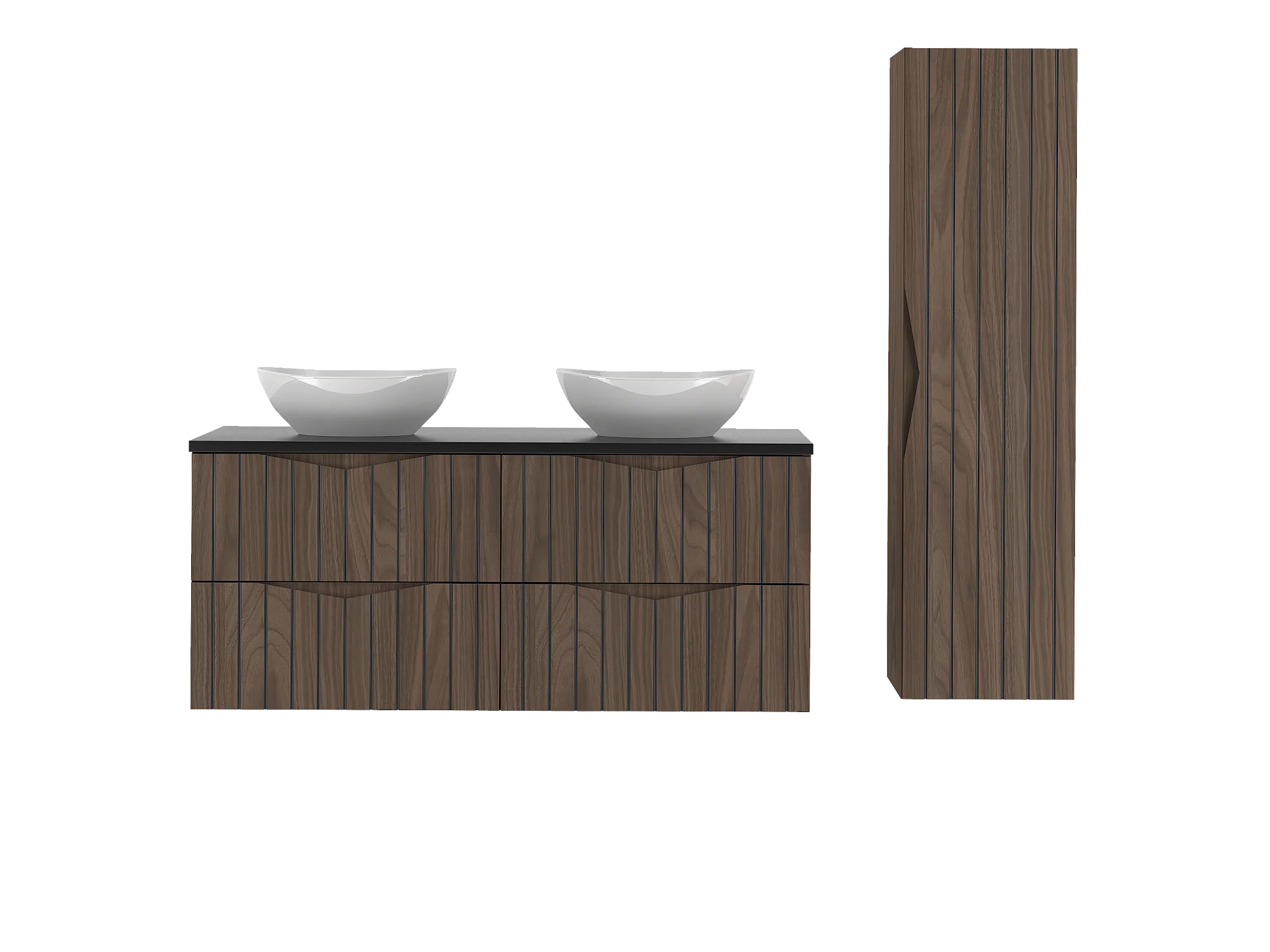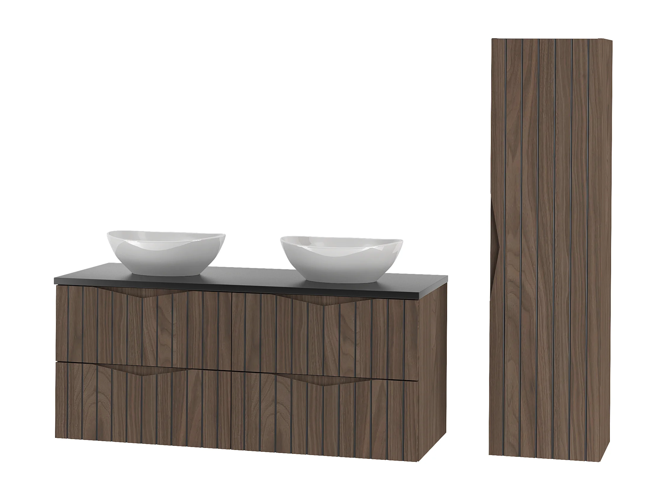 Ensemble de salle de bain 120 cm Armoire avec plan de travail Lavabo Colonne Façades rainurées Chêne Noyer Stella