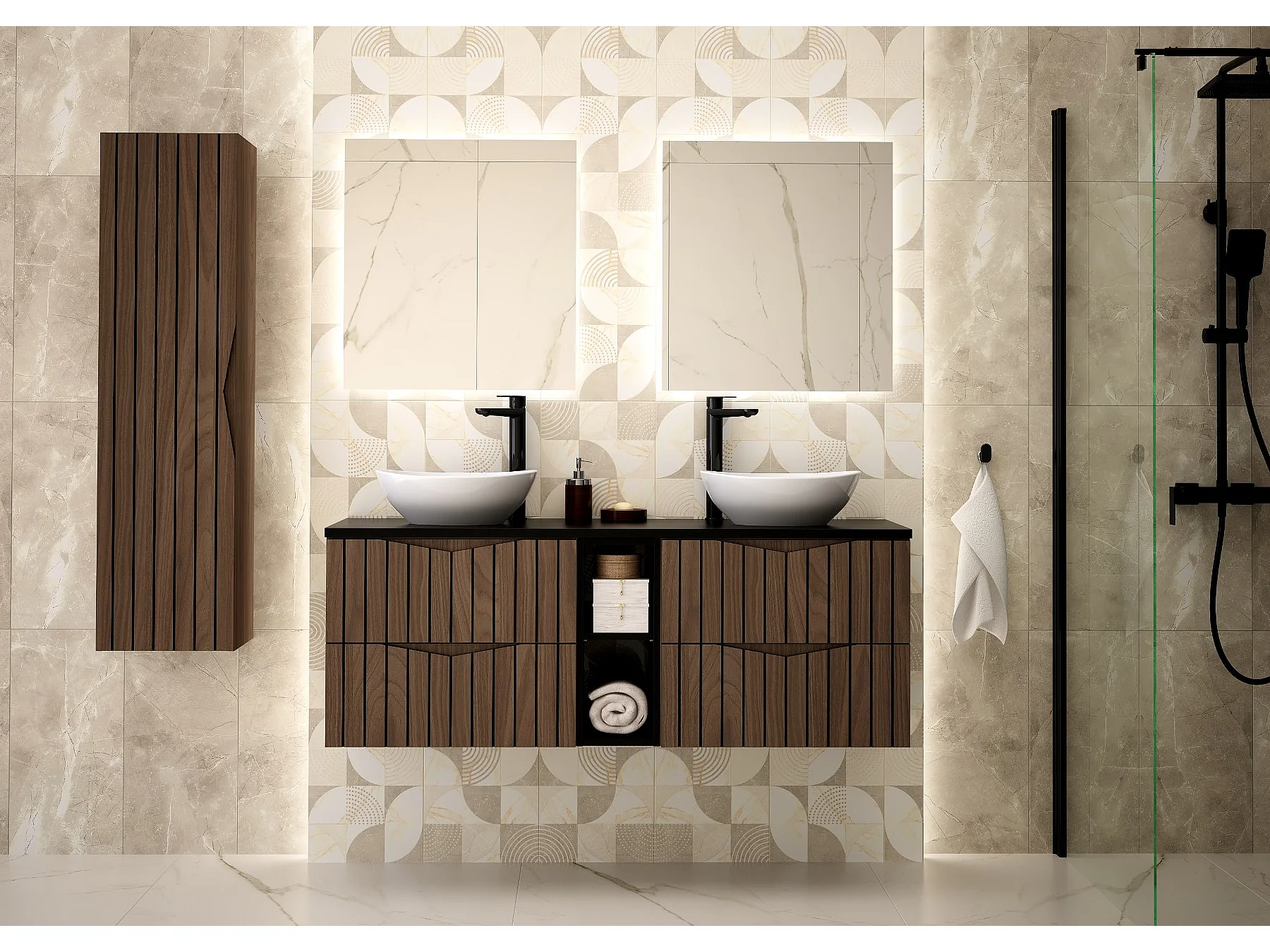 Ensemble de salle de bain 140 cm Armoire avec plateau Étagère Façades rainurées Chêne Noyer Stella