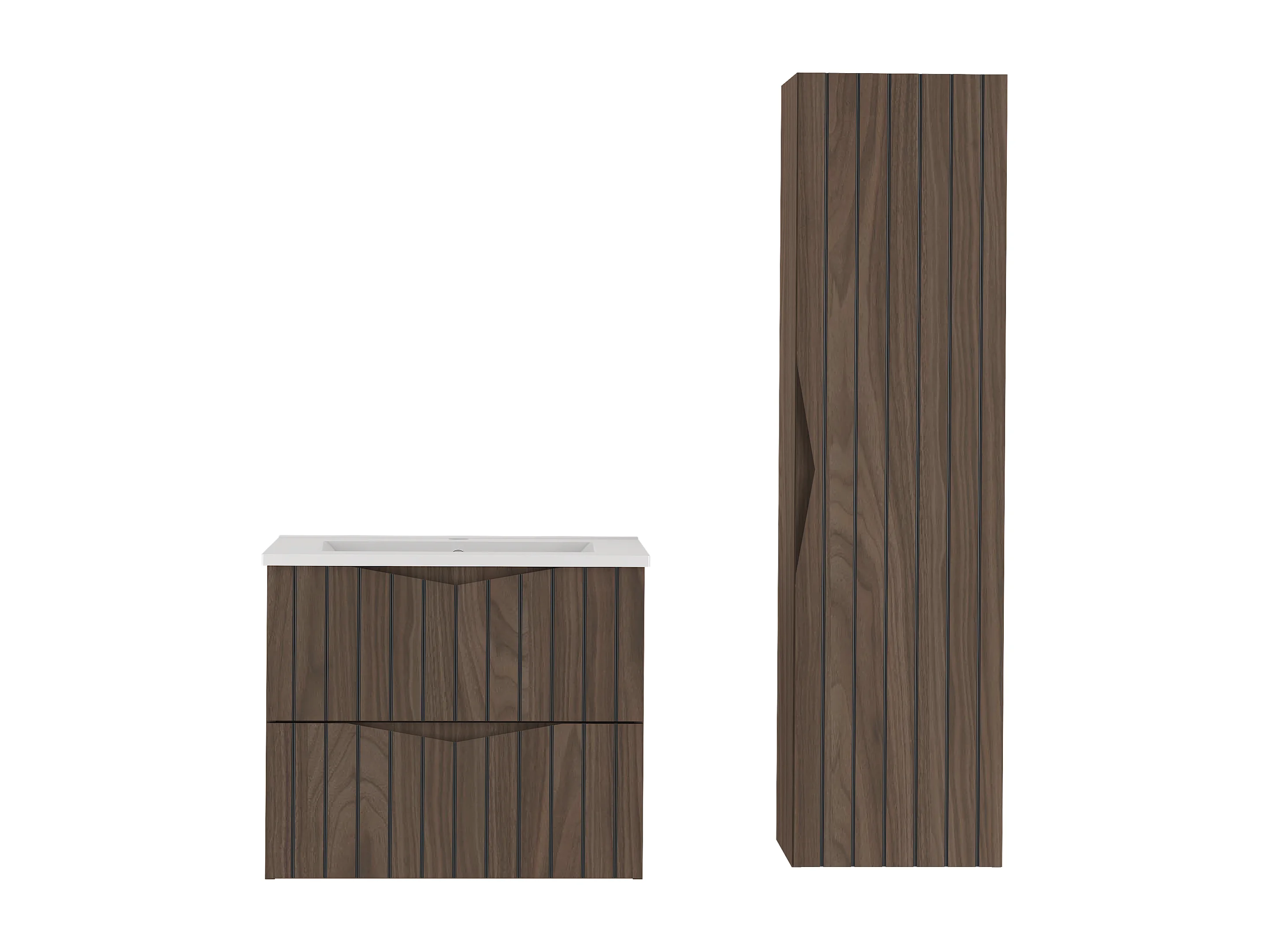 Ensemble de salle de bain 60 cm Meuble avec lavabo Colonne Façades rainurées Chêne Noyer Stella