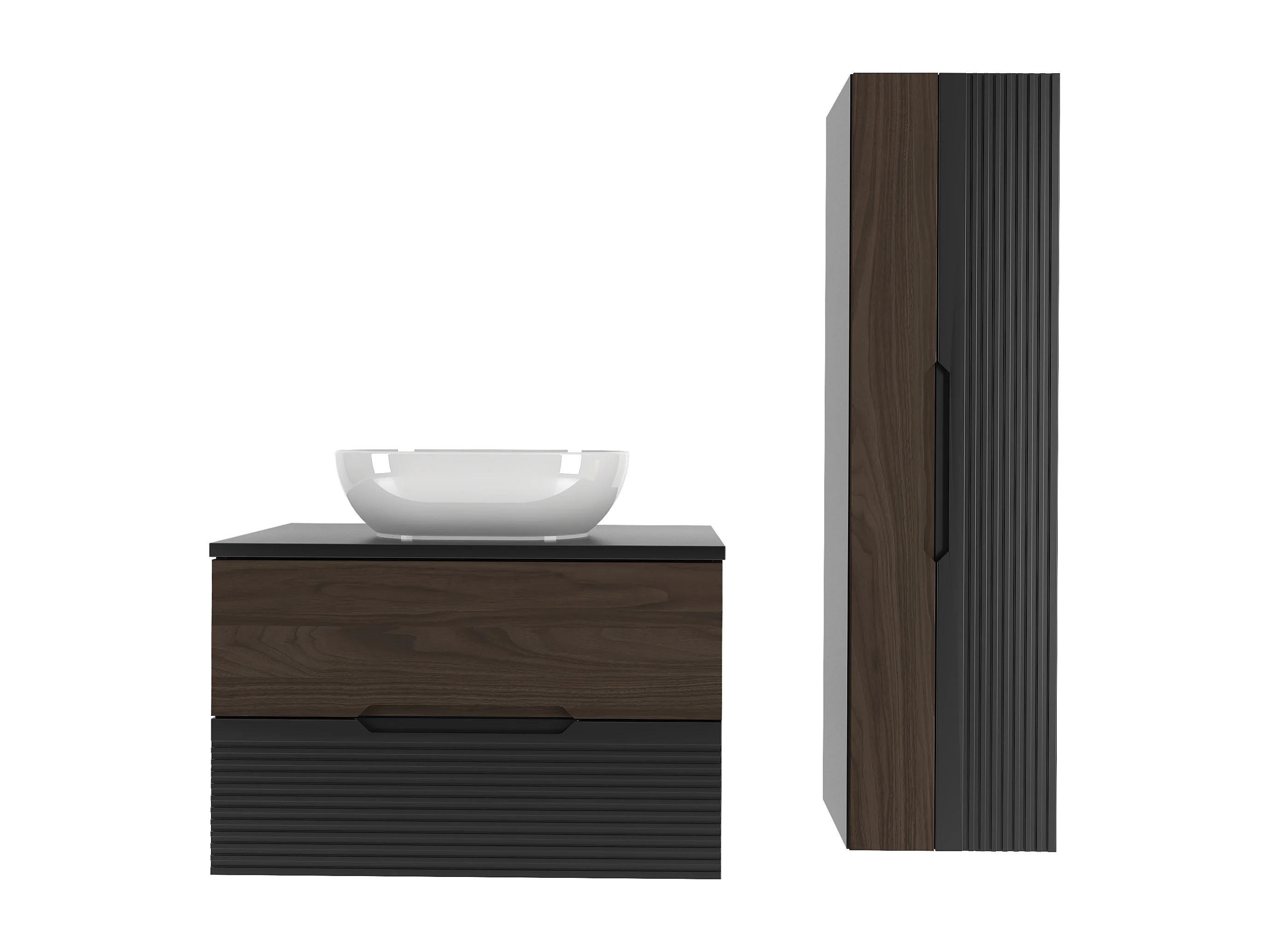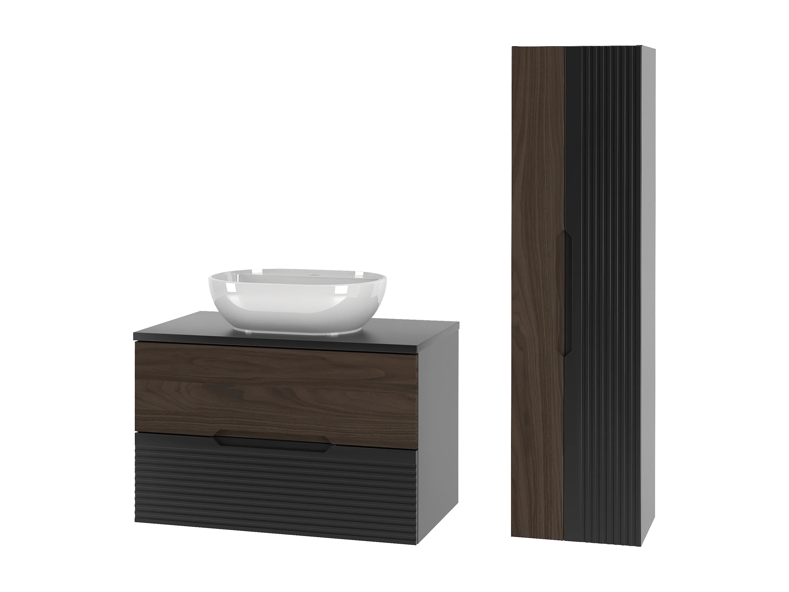 Ensemble de salle de bain 80 cm Meuble avec plan de travail Lavabo Colonne Noir mat / Noyer Avella