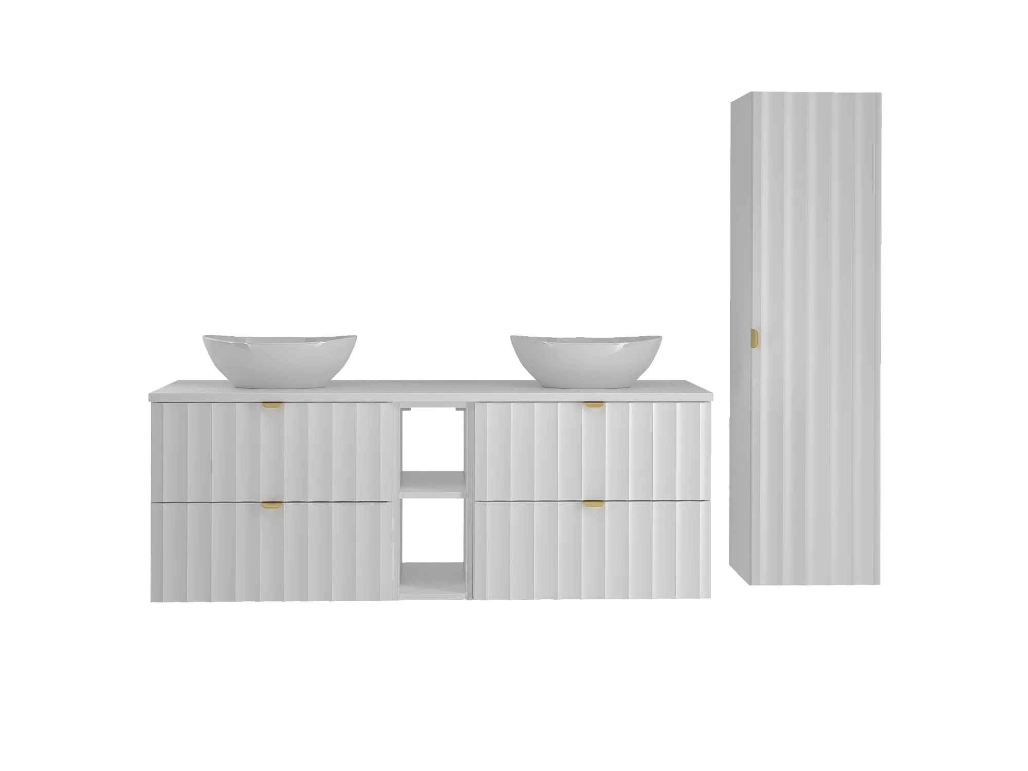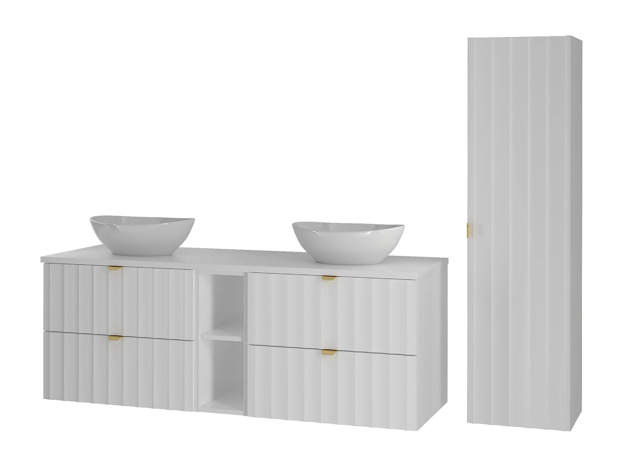Ensemble de salle de bain blanc 140 cm Armoire avec plan de travail Étagère Lavabo Colonne Façades rainurées Arcos