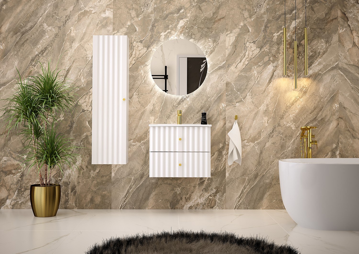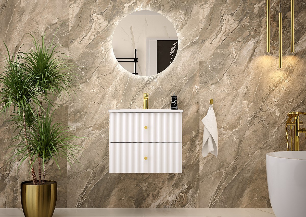 Ensemble de salle de bain blanc 60 cm Meuble avec lavabo Façades rainurées Aqua