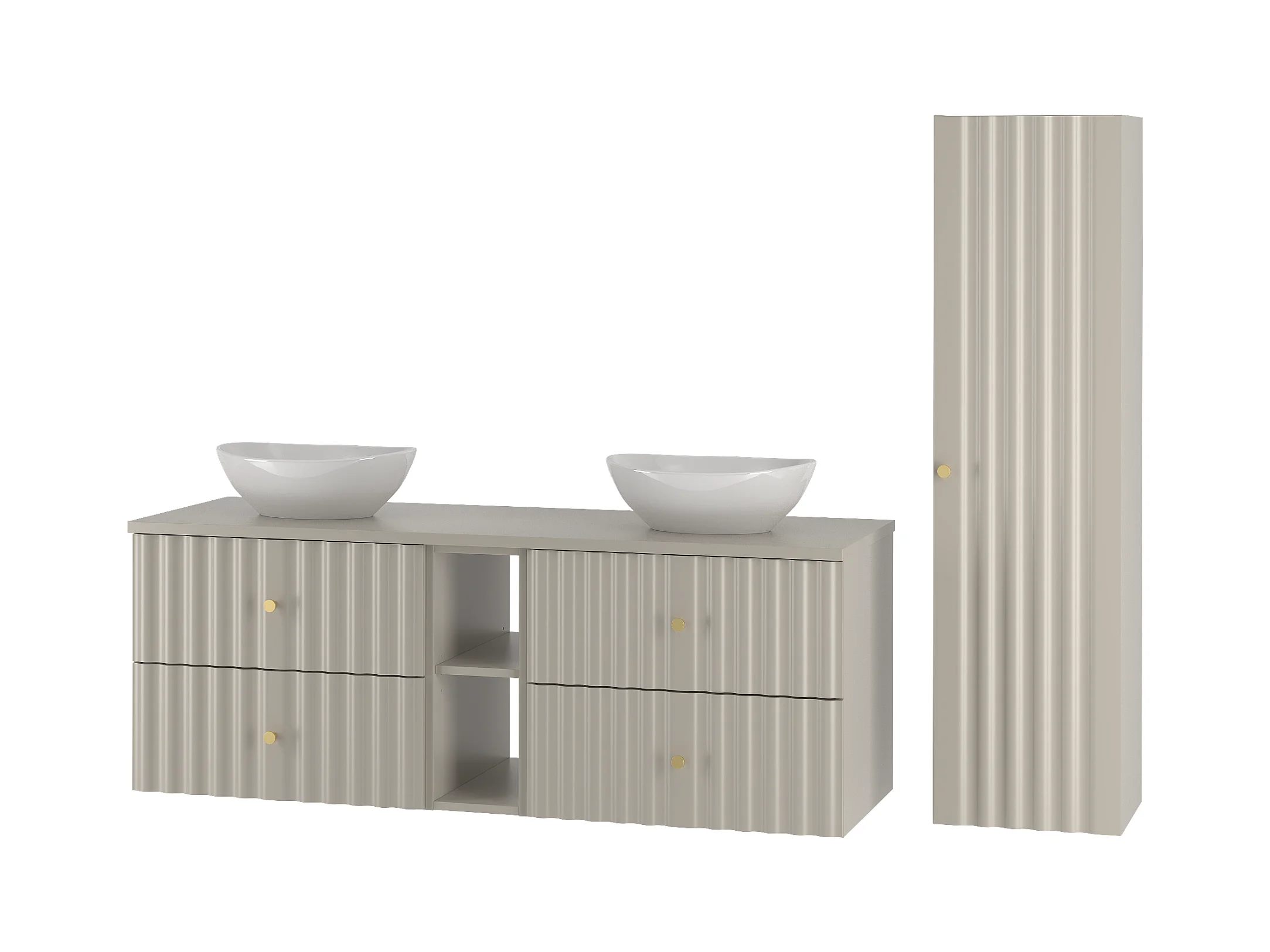 Meuble de salle de bain suspendu strié avec vasque à poser ronde et colonne - Coloris beige - 120 cm - ZEVARA