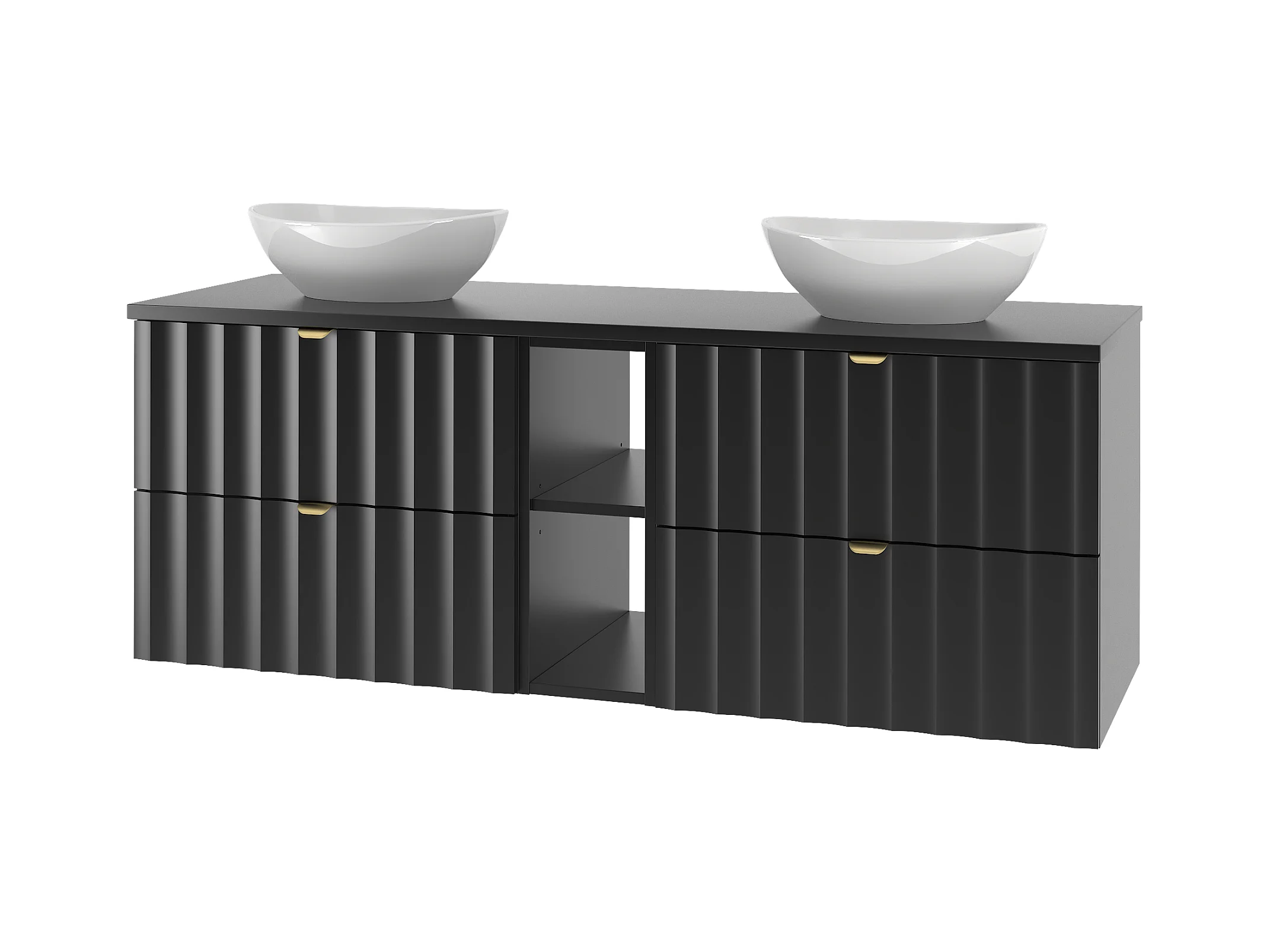 Meuble de salle de bain suspendu strié liseré doré avec double vasque à poser carrée - Noir - 120 cm - KELIZA