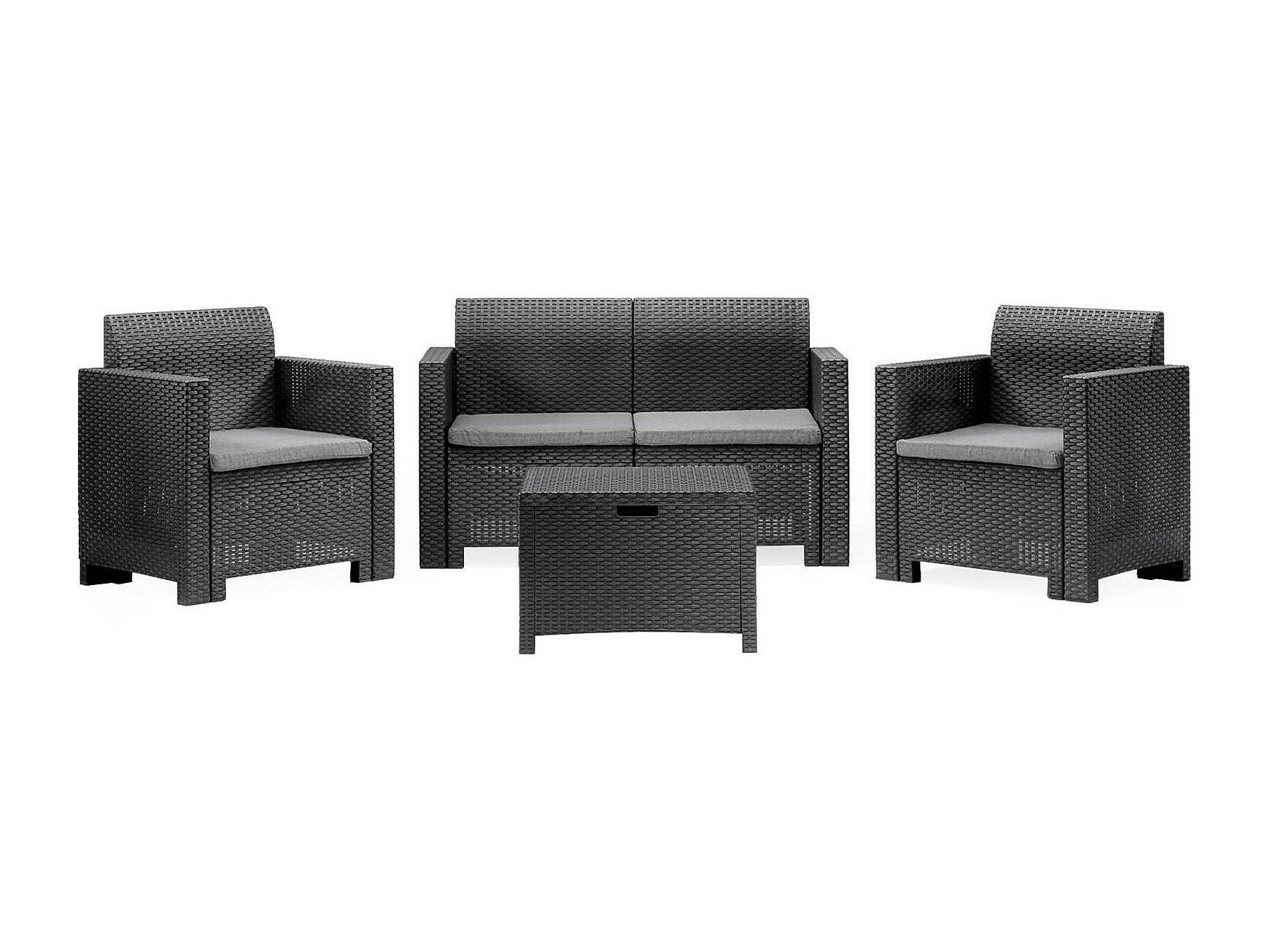 Salon d'extérieur Dbalestrer, Salon de jardin avec 2 fauteuils, 1 canapé et 1 table de rangement, Effet rotin avec coussins, 100% Made in Italy, Anthracite