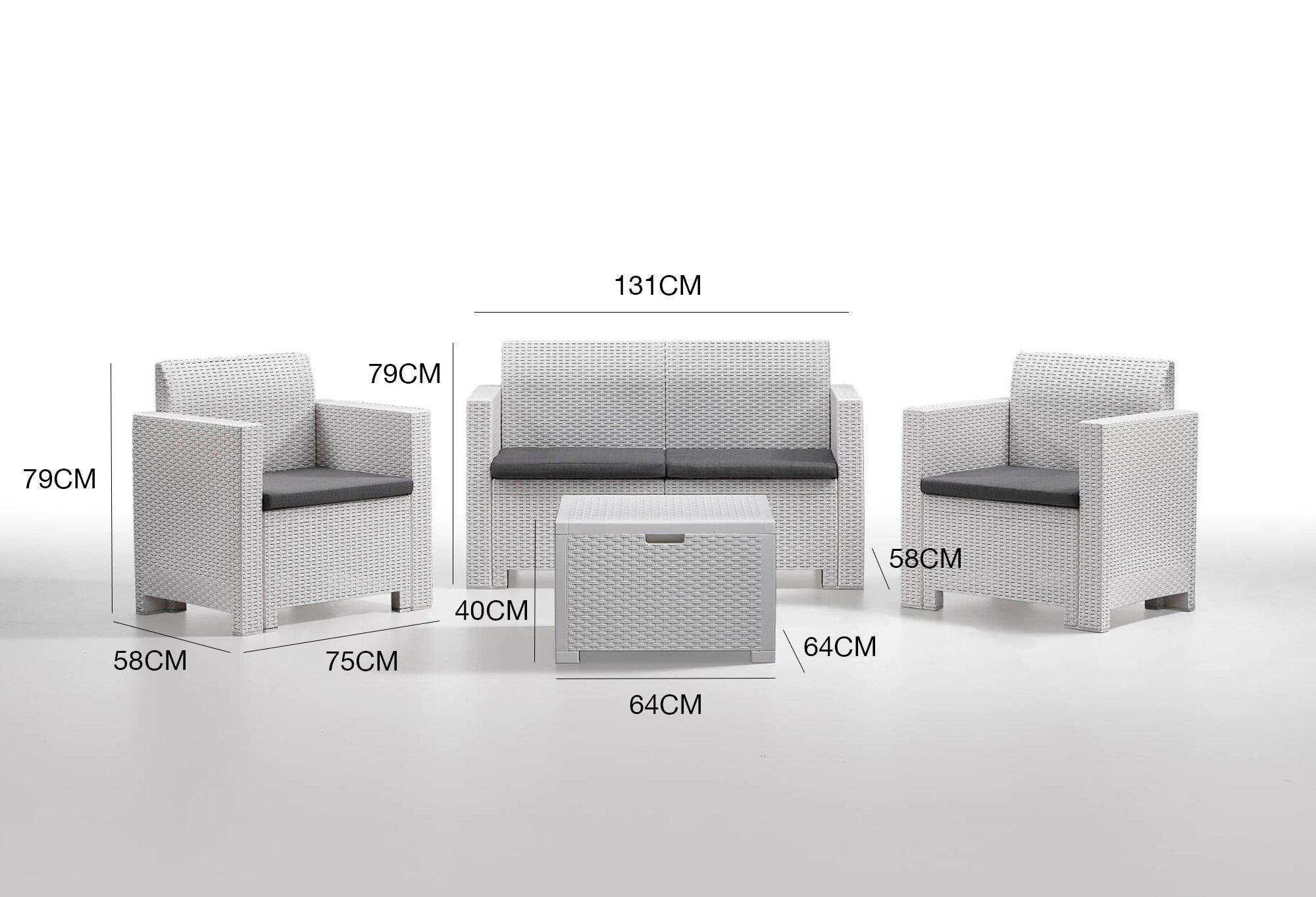 Ensemble de salon d'extérieur Carpi, Composition de jardin avec 2 fauteuils, 1 canapé et 1 table basse, Salon effet rotin avec coussins, 100% Made in Italy, Blanc
