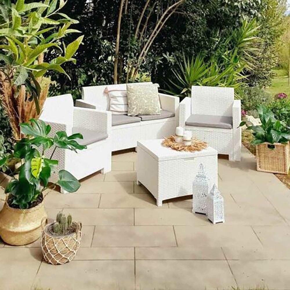 Ensemble de salon d'extérieur Dmotto, Salon de jardin avec coussins, Salon d'intérieur effet rotin, 100% Made in Italy, Blanc