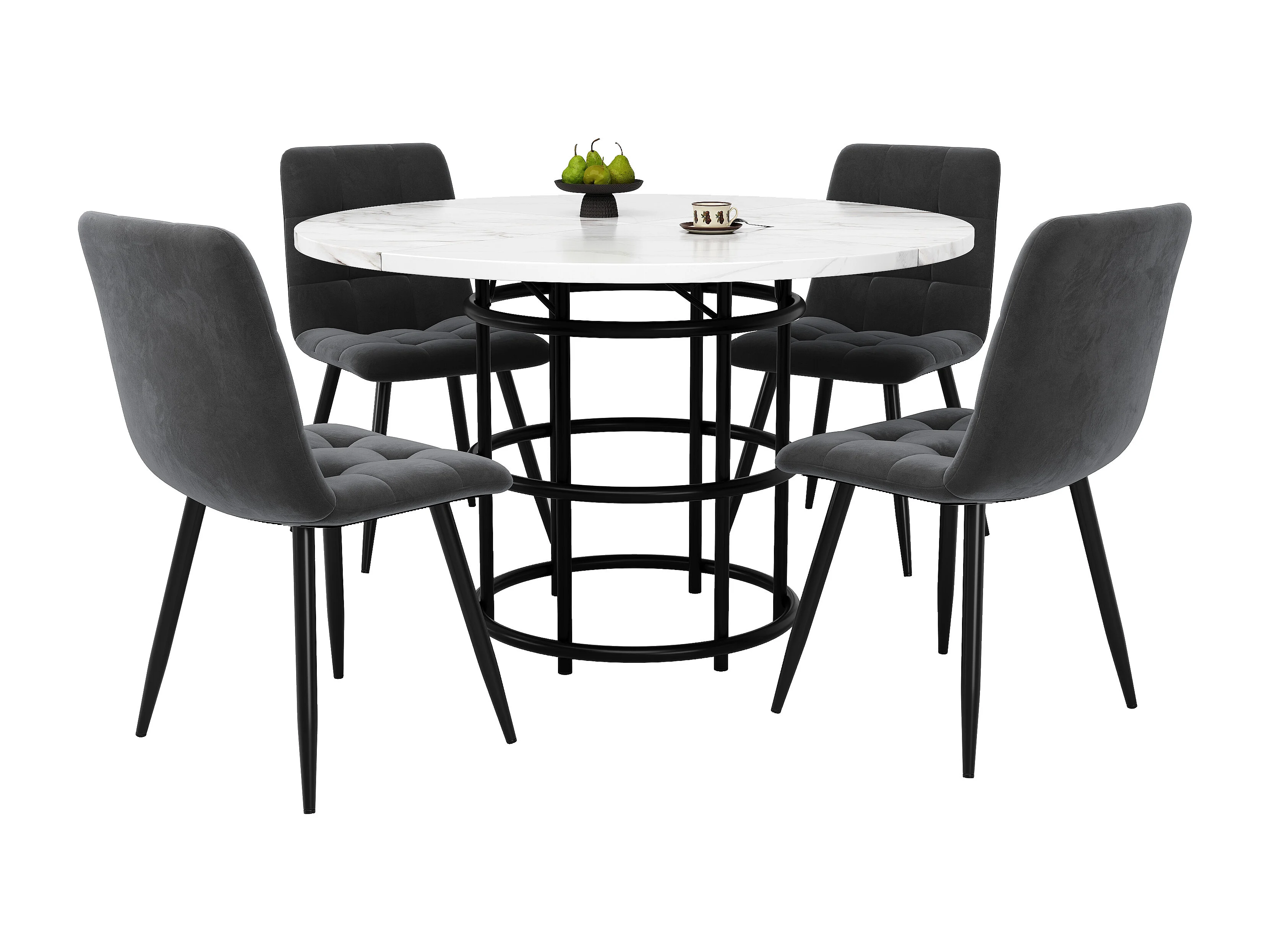 Ensemble de table à manger (5 pièces), table ronde avec 4 chaises, MDF blanc, siège en velours gris (100×100×76 cm)
