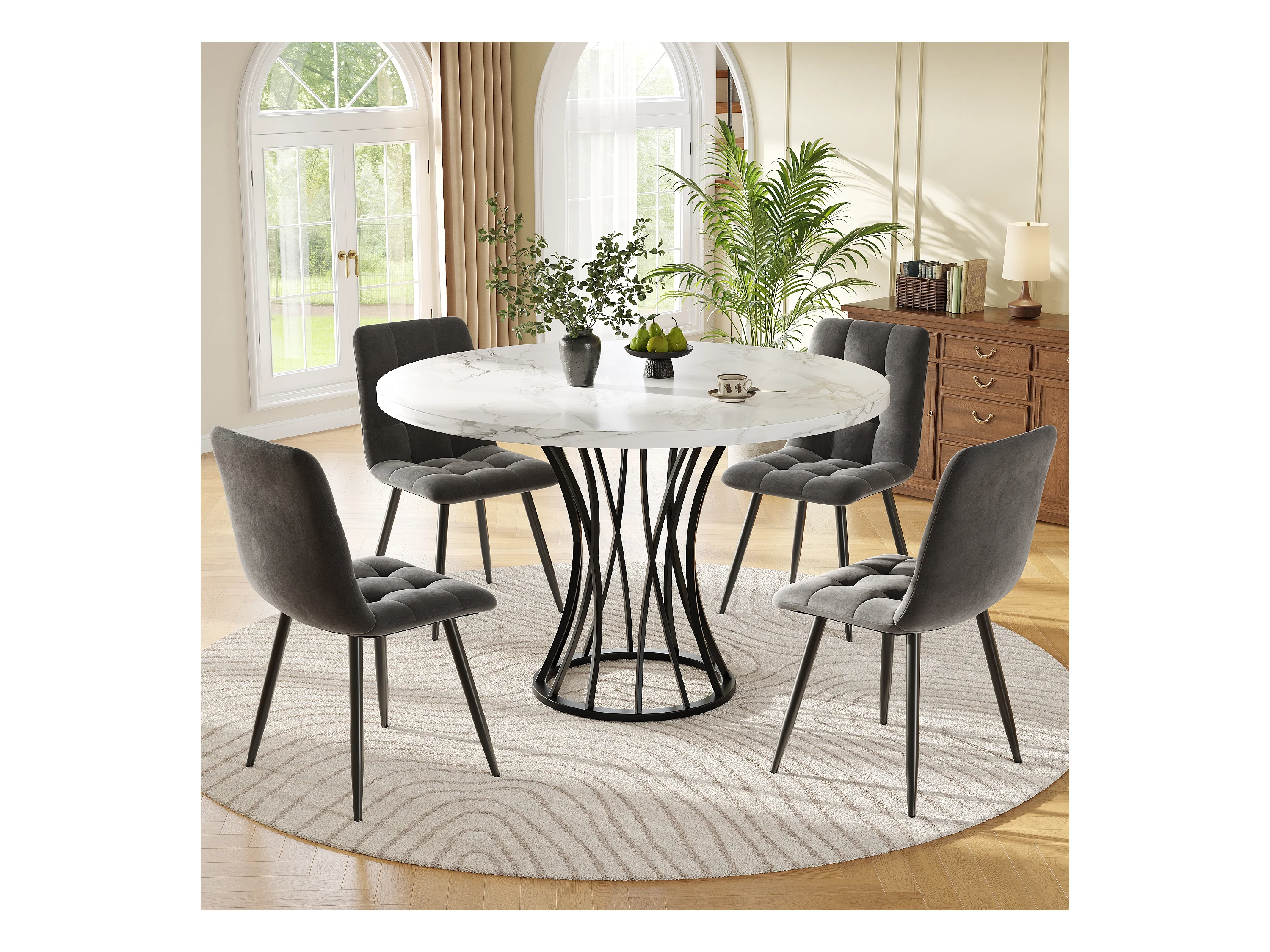 Ensemble de table à manger (5 pièces), table ronde avec 4 chaises, MDF, métal, velours, blanc marbré (80x80x76 cm)