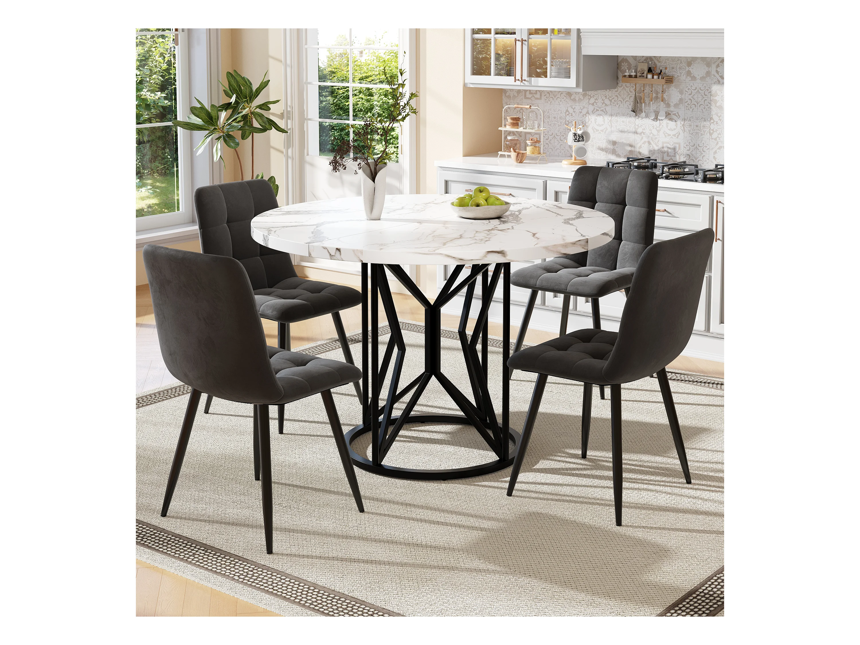 Ensemble de table à manger (5 pièces), table ronde avec 4 chaises, MDF, velours, blanc marbré (100x100x76 cm)