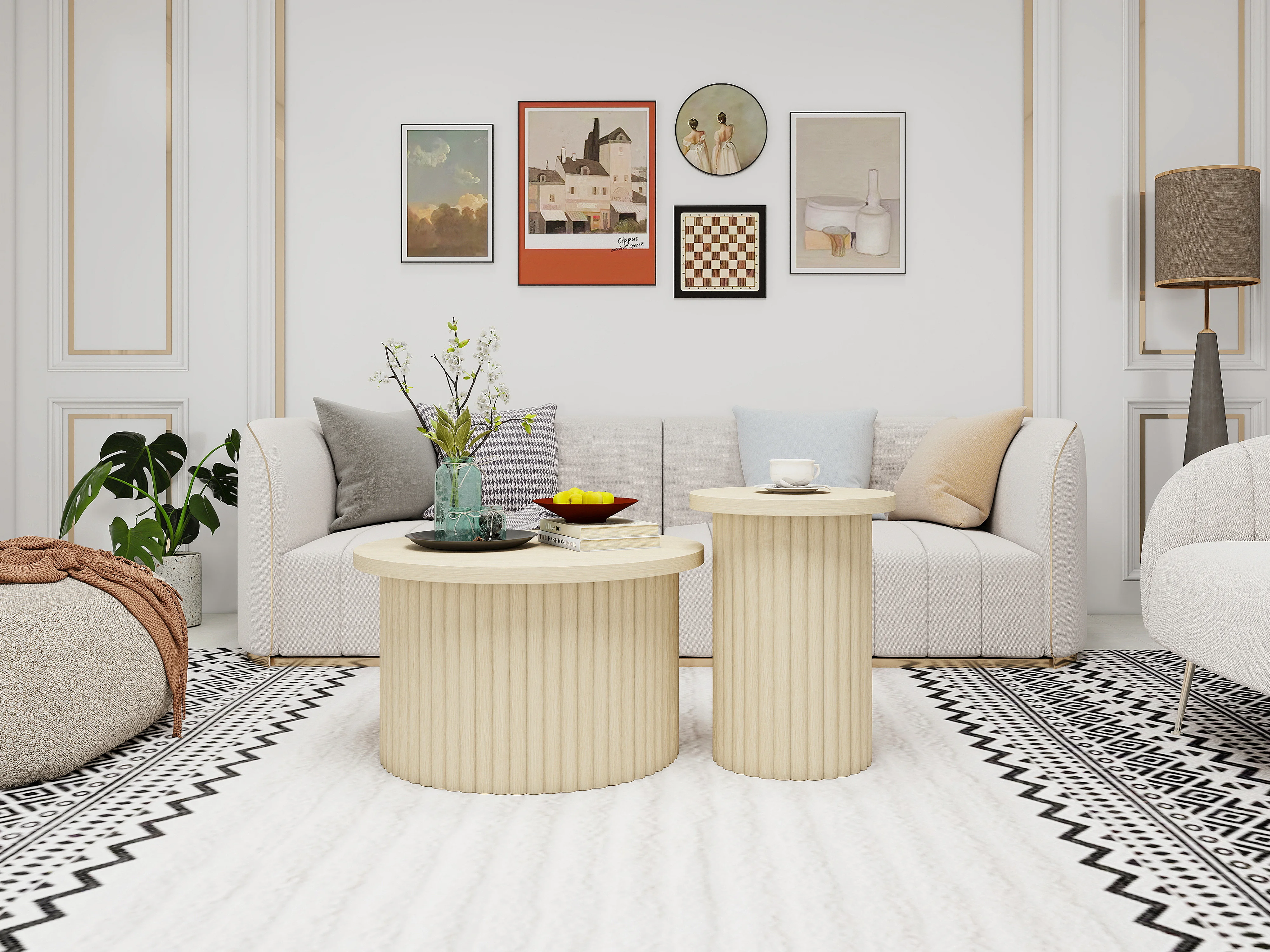 Ensemble de tables basses rondes, design en bois naturel, 2 pièces, MDF, avec base ondulée (68.7x40.6 cm, 40.1x51.7 cm)