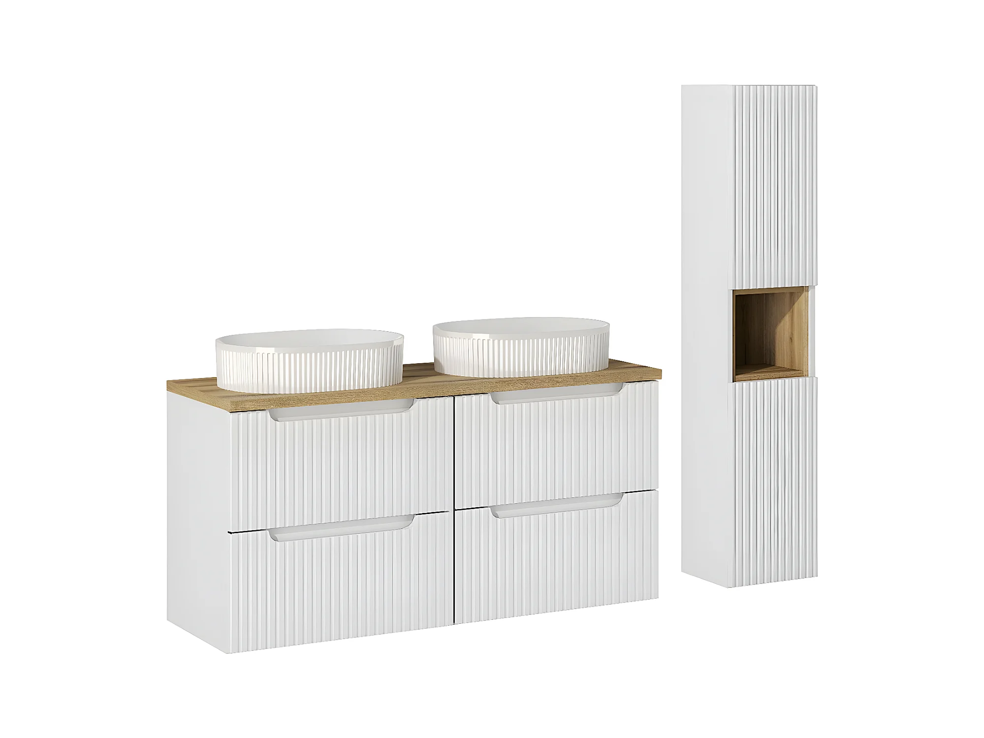Ensemble meuble double vasque 120cm 4 tiroirs et colonne Riva Blanc et Bois
