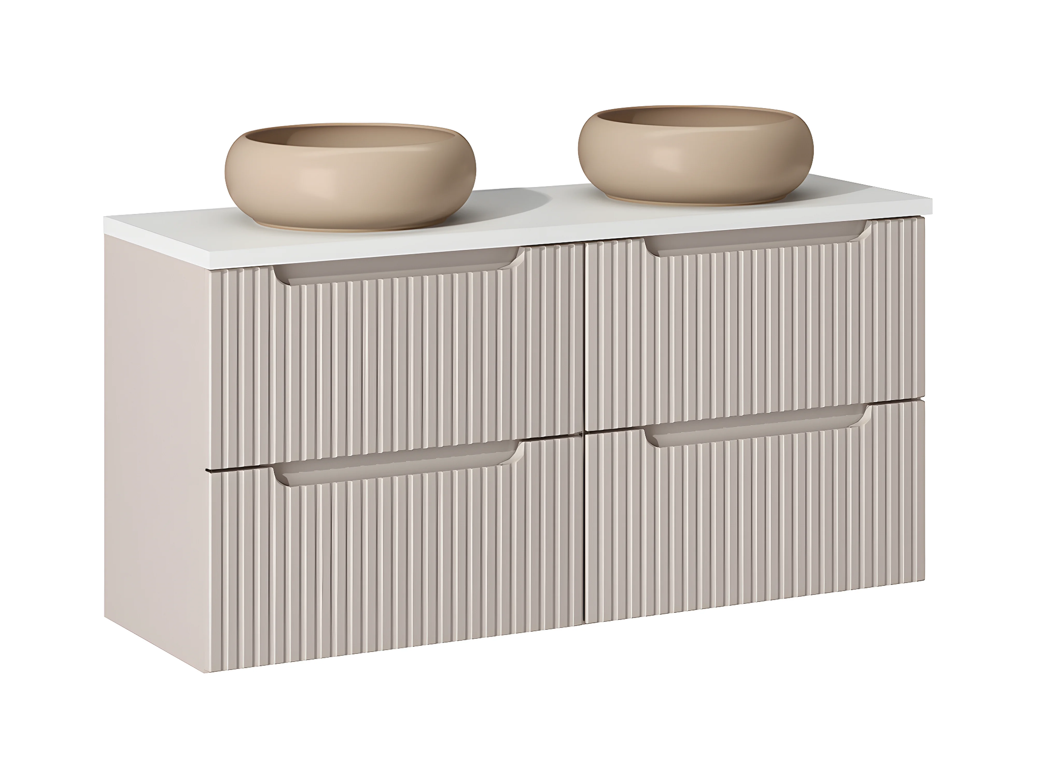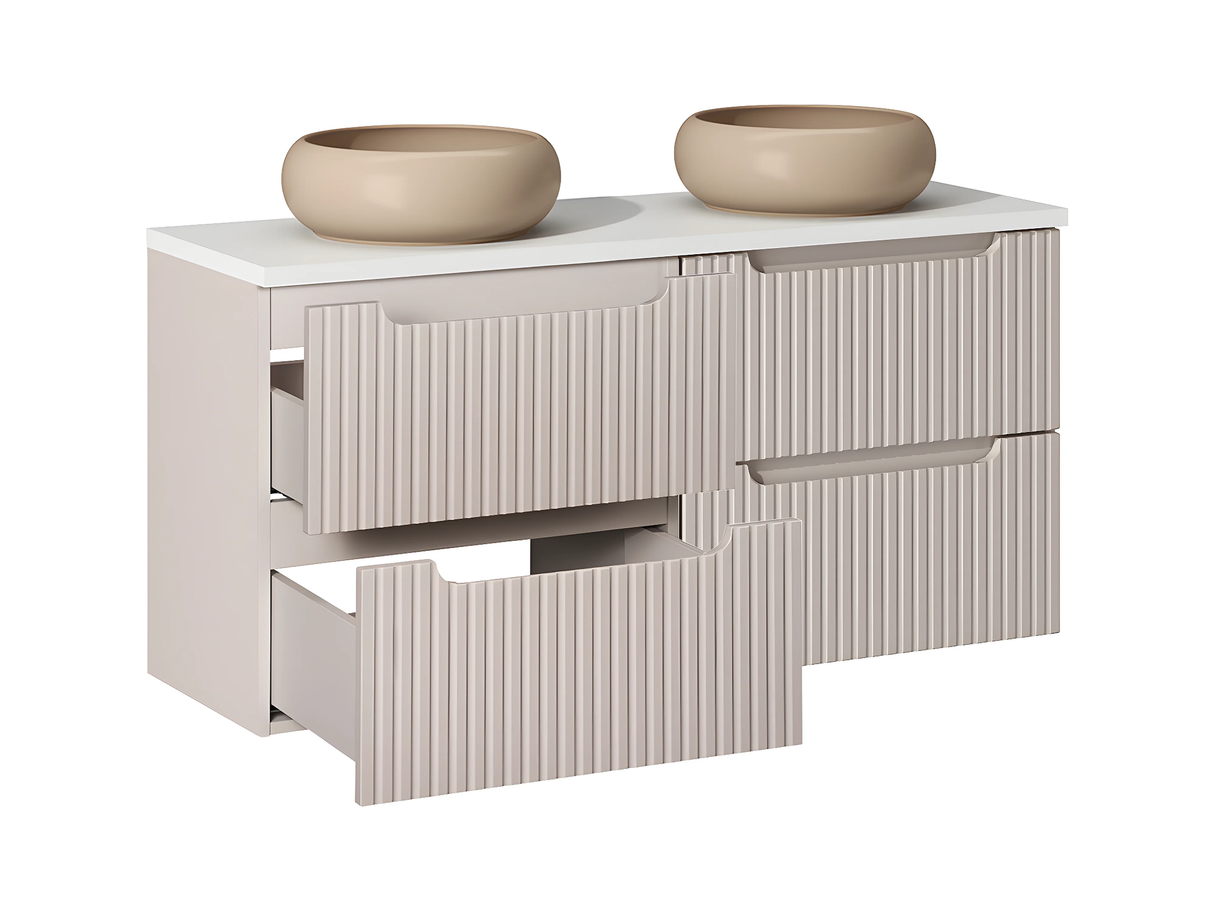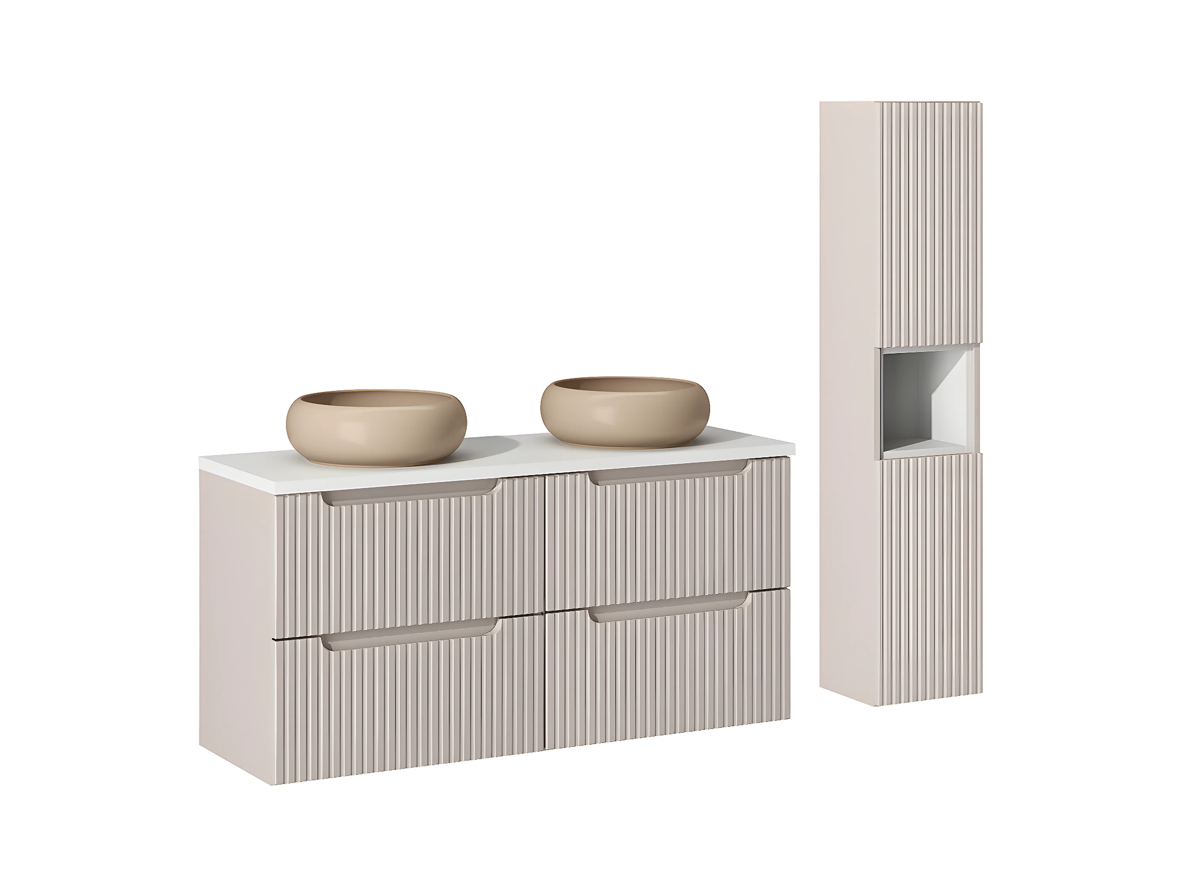 Ensemble meuble double vasque 120cm 4 tiroirs et colonne Riva Cachemire et Blanc
