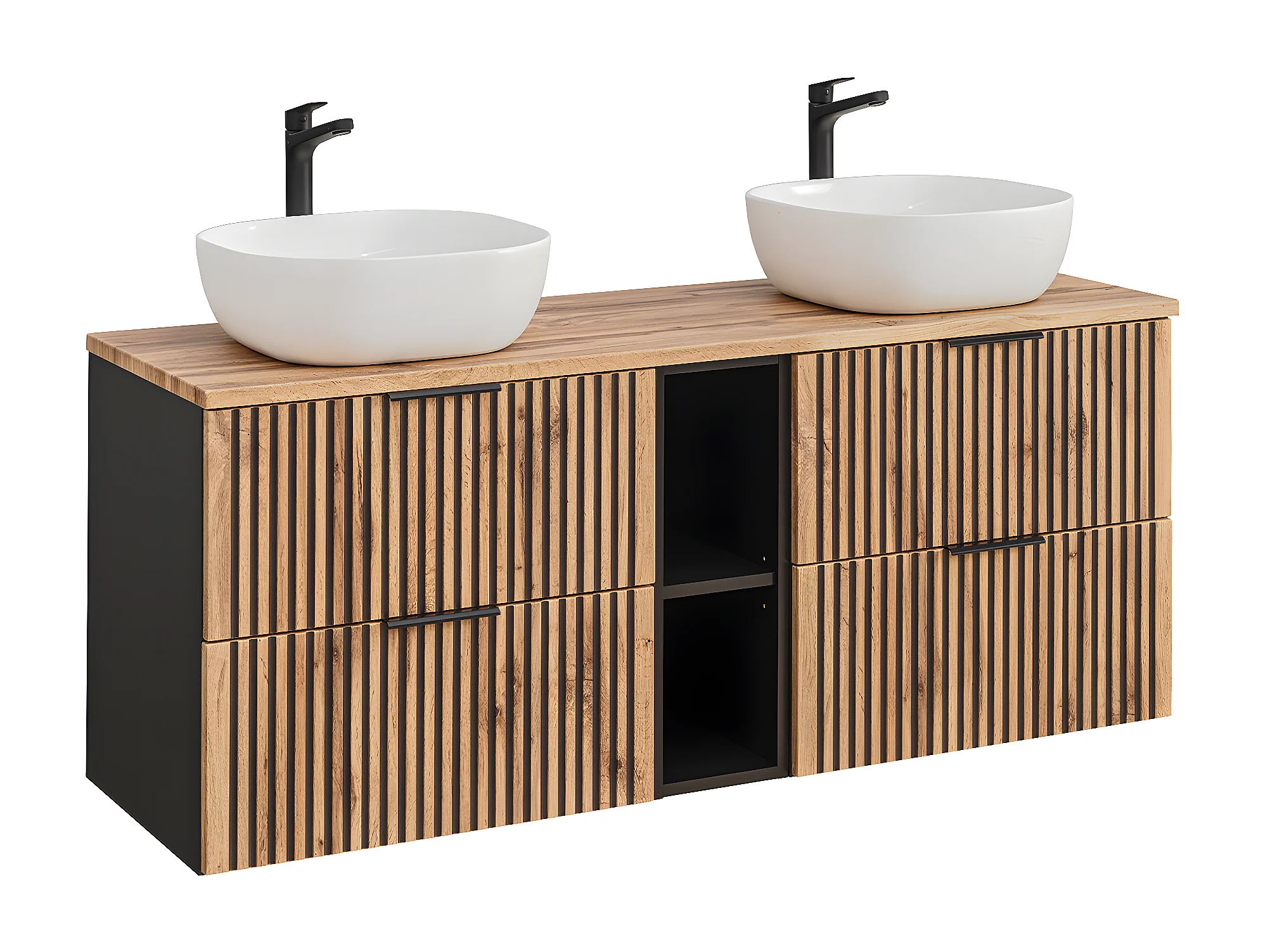 Ensemble meuble double vasque 140cm 2 niches et colonne Gaia Bois et Noir - Vasque Noir