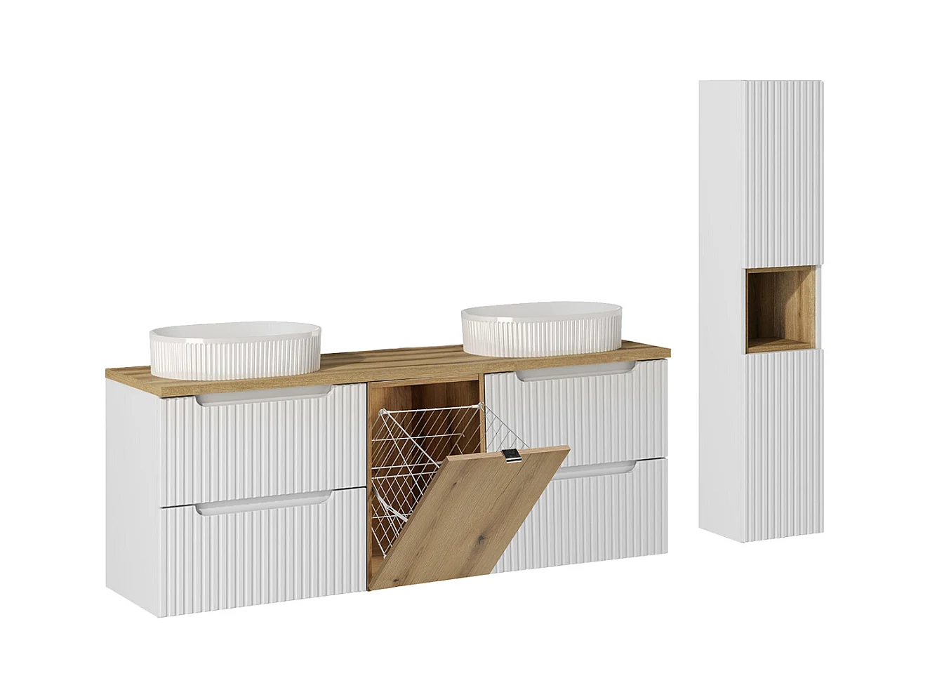 Ensemble meuble double vasque 160cm panier à linge et colonne Riva Blanc et Bois