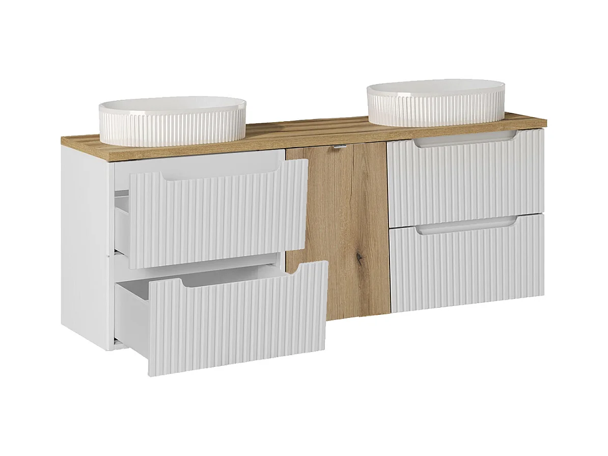 Ensemble meuble double vasque 140cm 4 tiroirs et colonne Riva Blanc et Bois