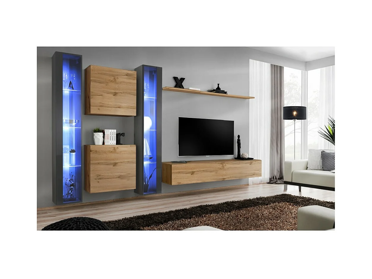 Ensemble meuble salon mural SWITCH XVI design, coloris chêne Wotan et gris brillant.