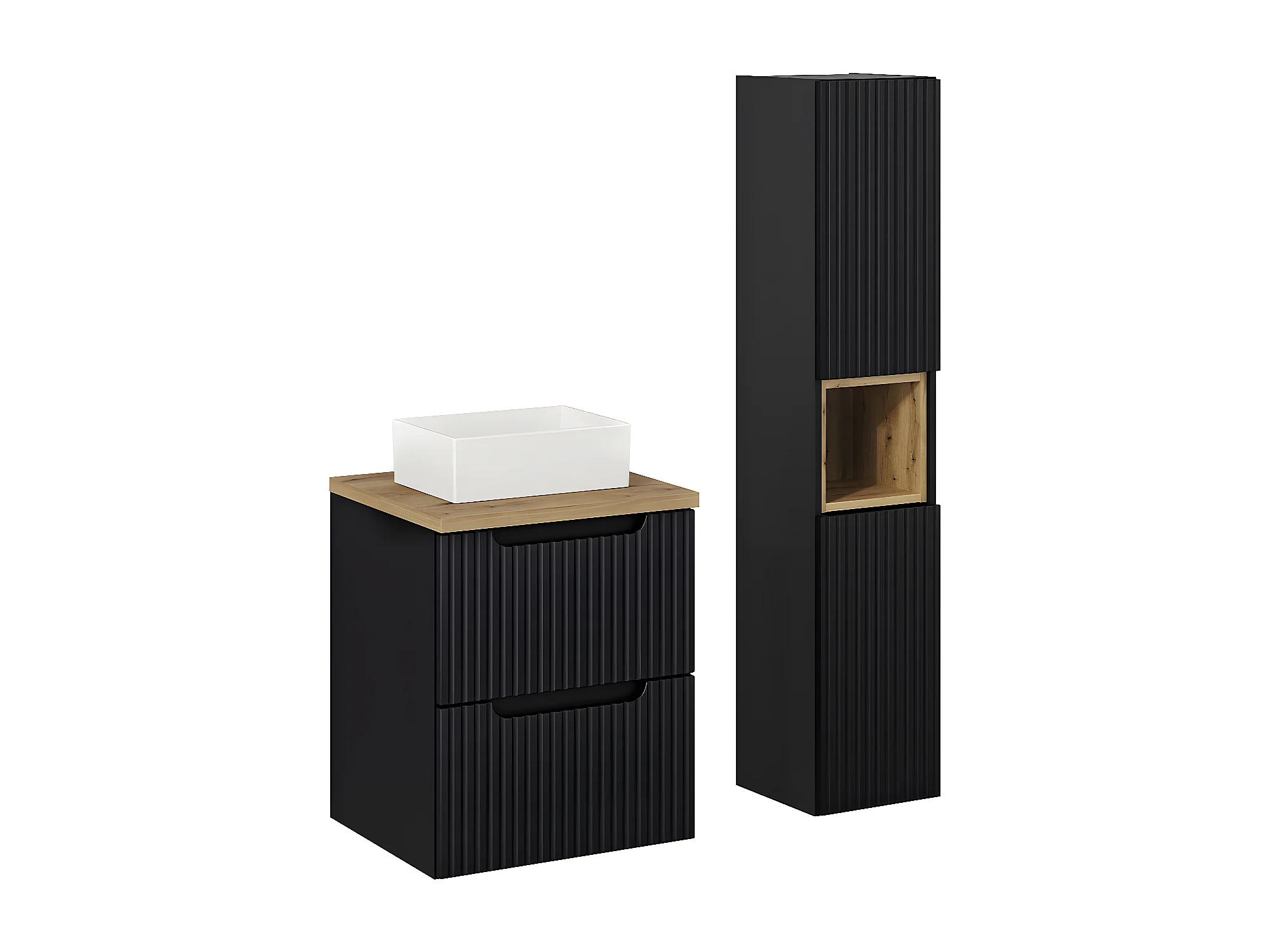 Ensemble meuble simple vasque encastrée 60cm 2 tiroirs et colonne Riva Noir et Bois