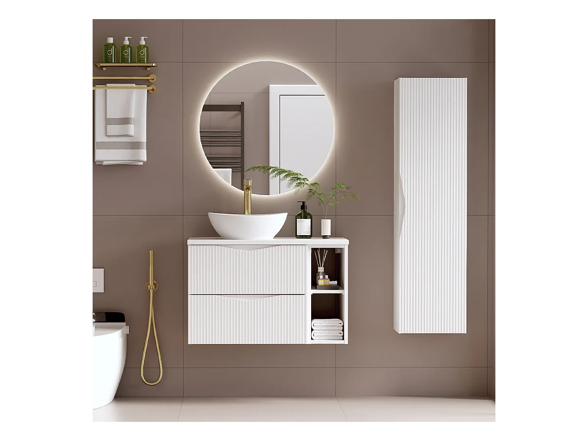Meuble de salle de bain suspendu strié avec vasque à encastrer et colonne - Blanc mat - 60 cm - ZEVINI