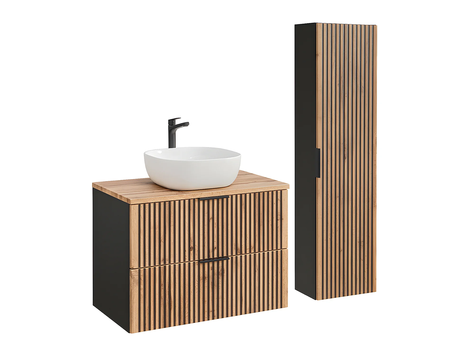Ensemble meuble simple vasque 80cm et colonne Adriel Noir et Bois