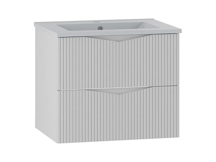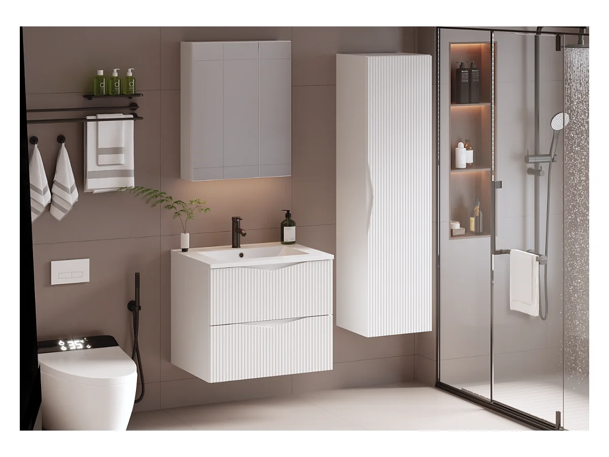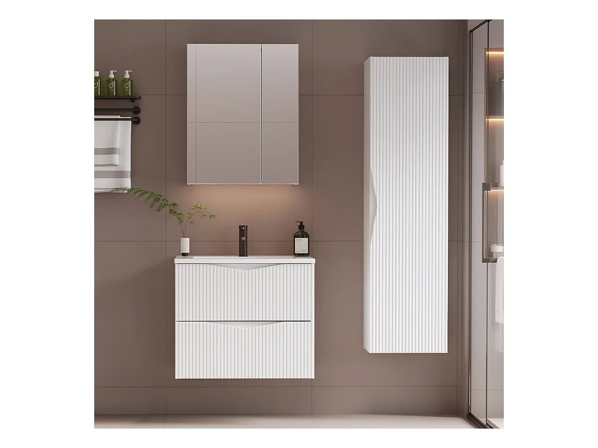 Meuble de salle de bain suspendu strié avec vasque à encastrer et colonne - Blanc mat - 60 cm - ZEVINI