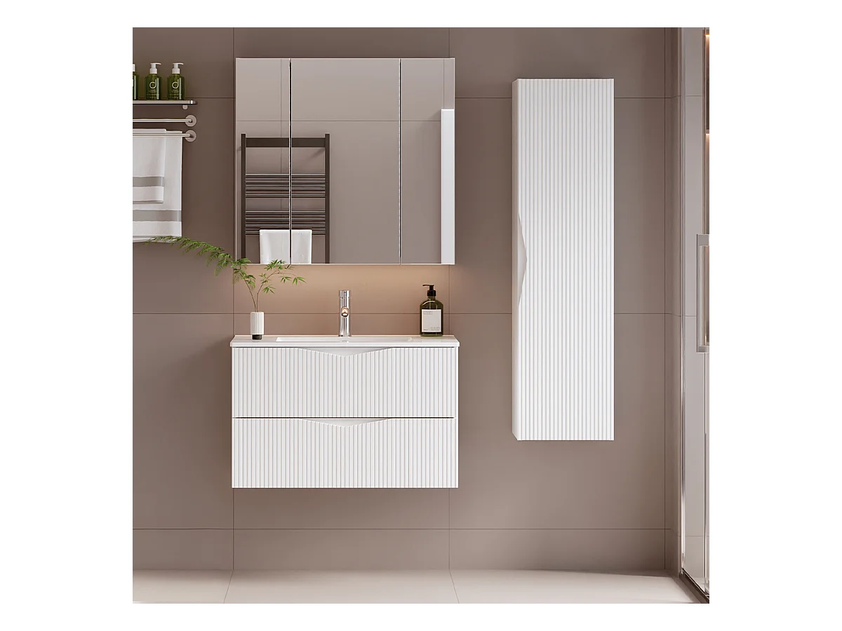 Meuble de salle de bain suspendu strié avec vasque à encastrer et colonne - Blanc mat - 60 cm - ZEVINI
