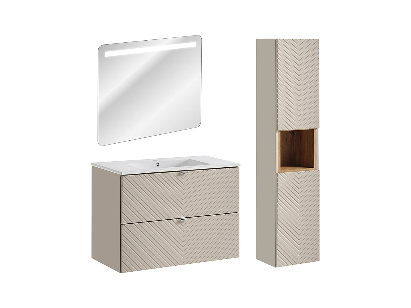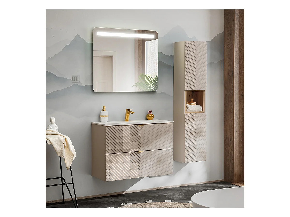 Ensemble pour salle de bain 80 cm Meuble avec lavabo Colonne Meuble avec miroir Façades rainurées Aria
