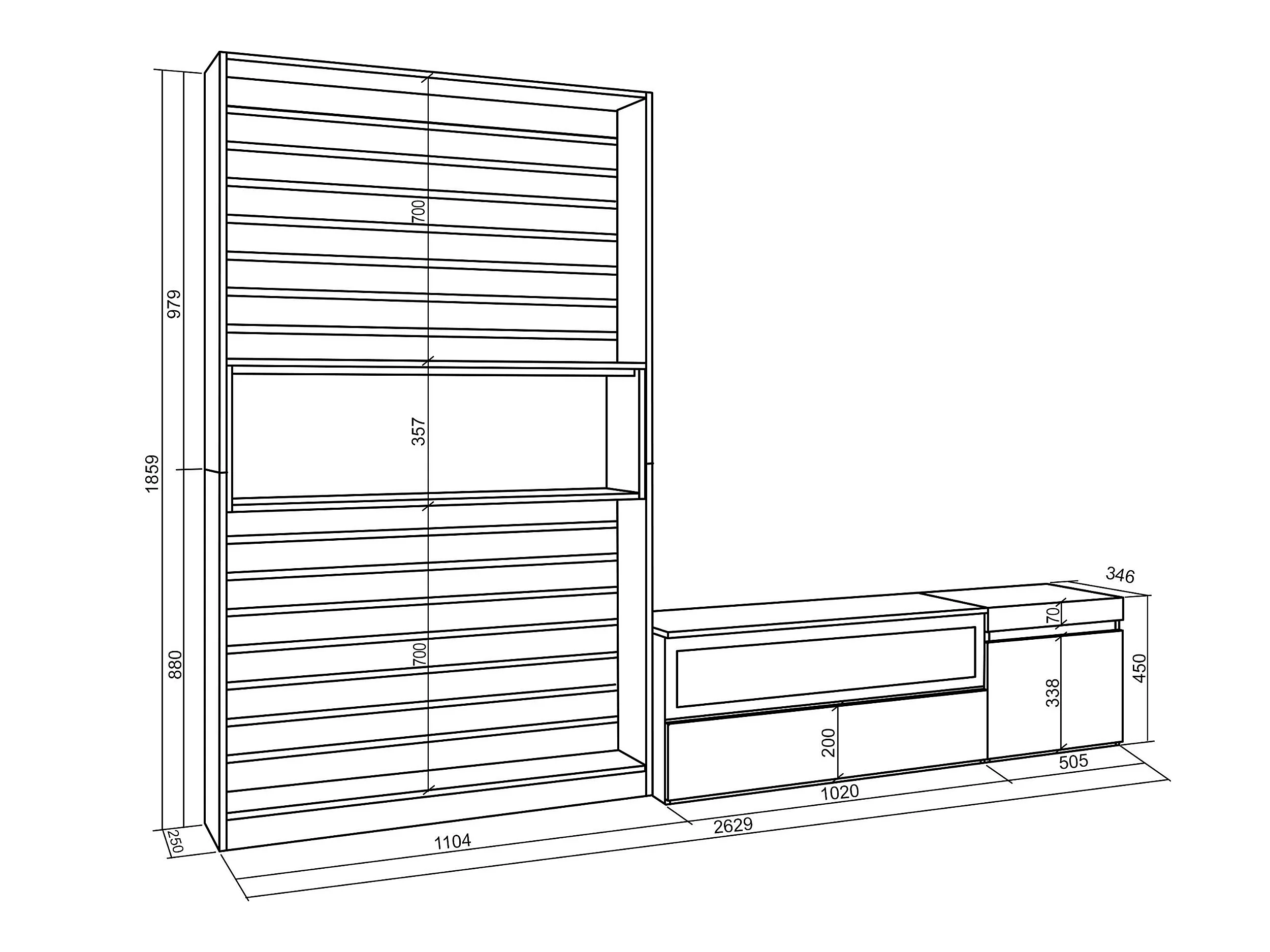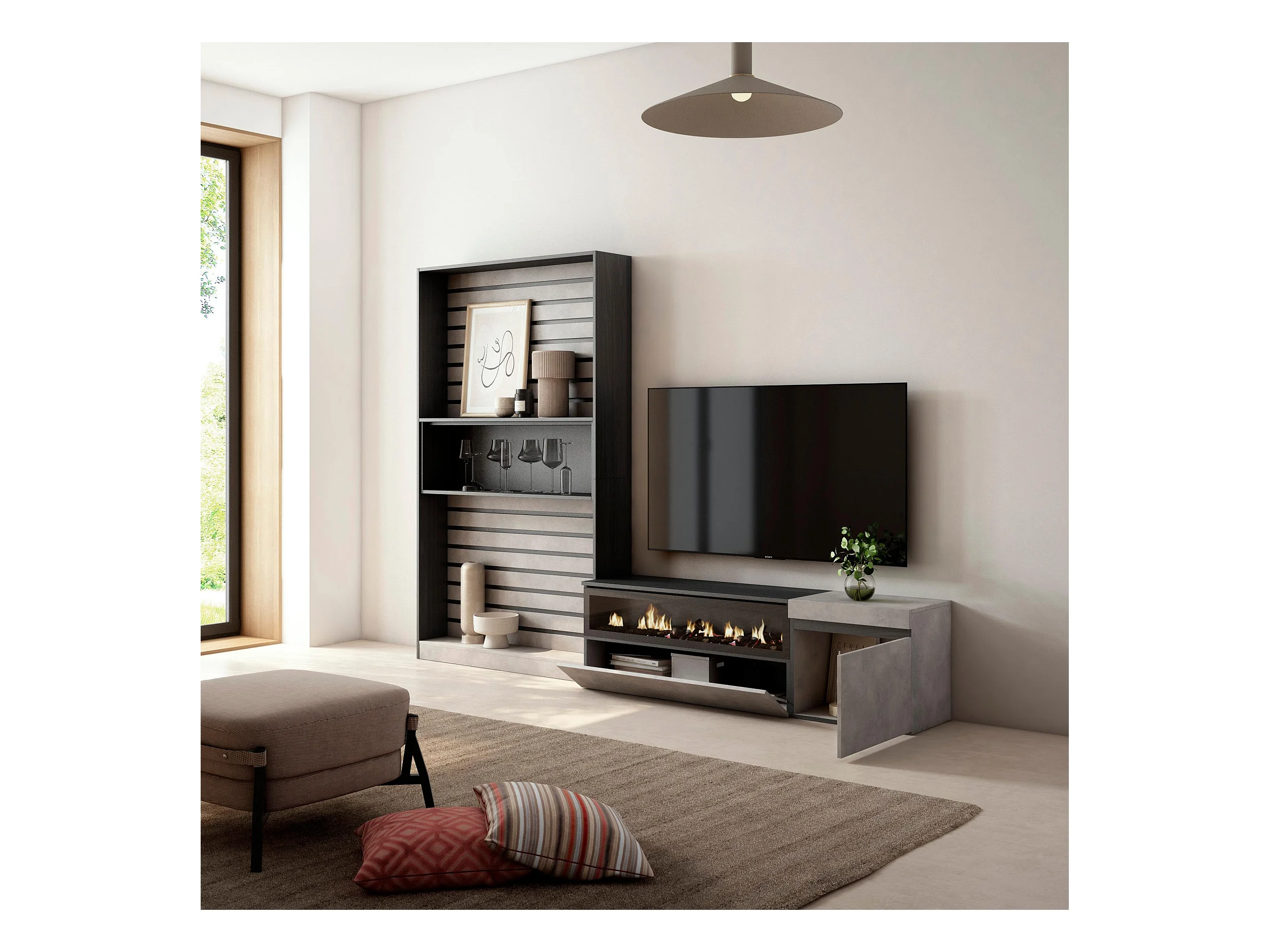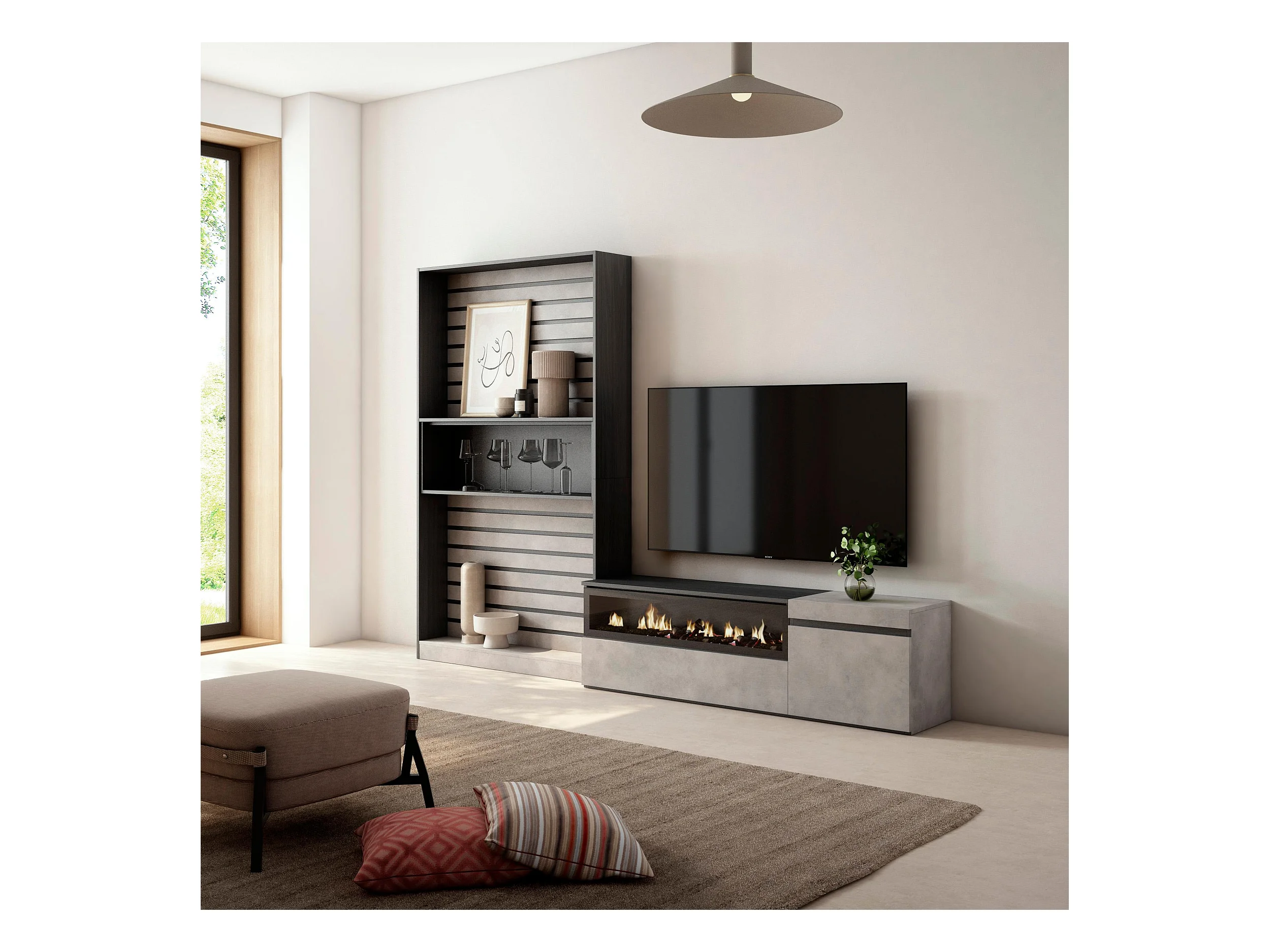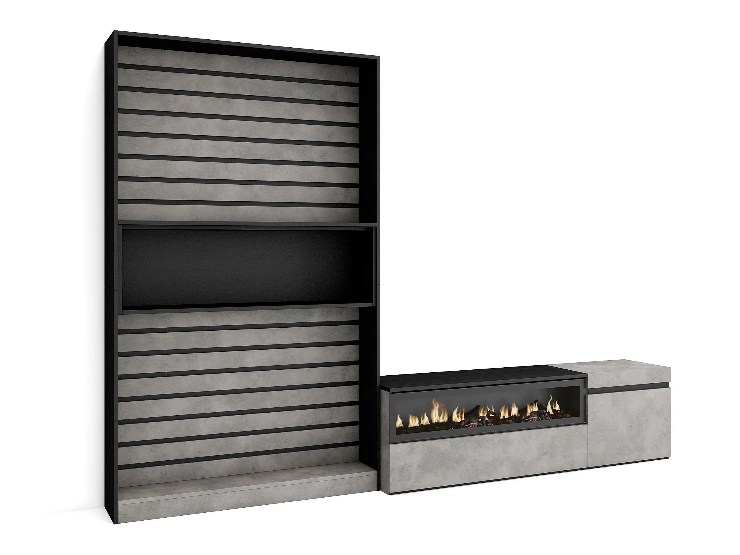 Ensemble Meuble TV, 260x186x35cm, Pour les TV jusqu'à 65", Cheminée électrique, Ciment
