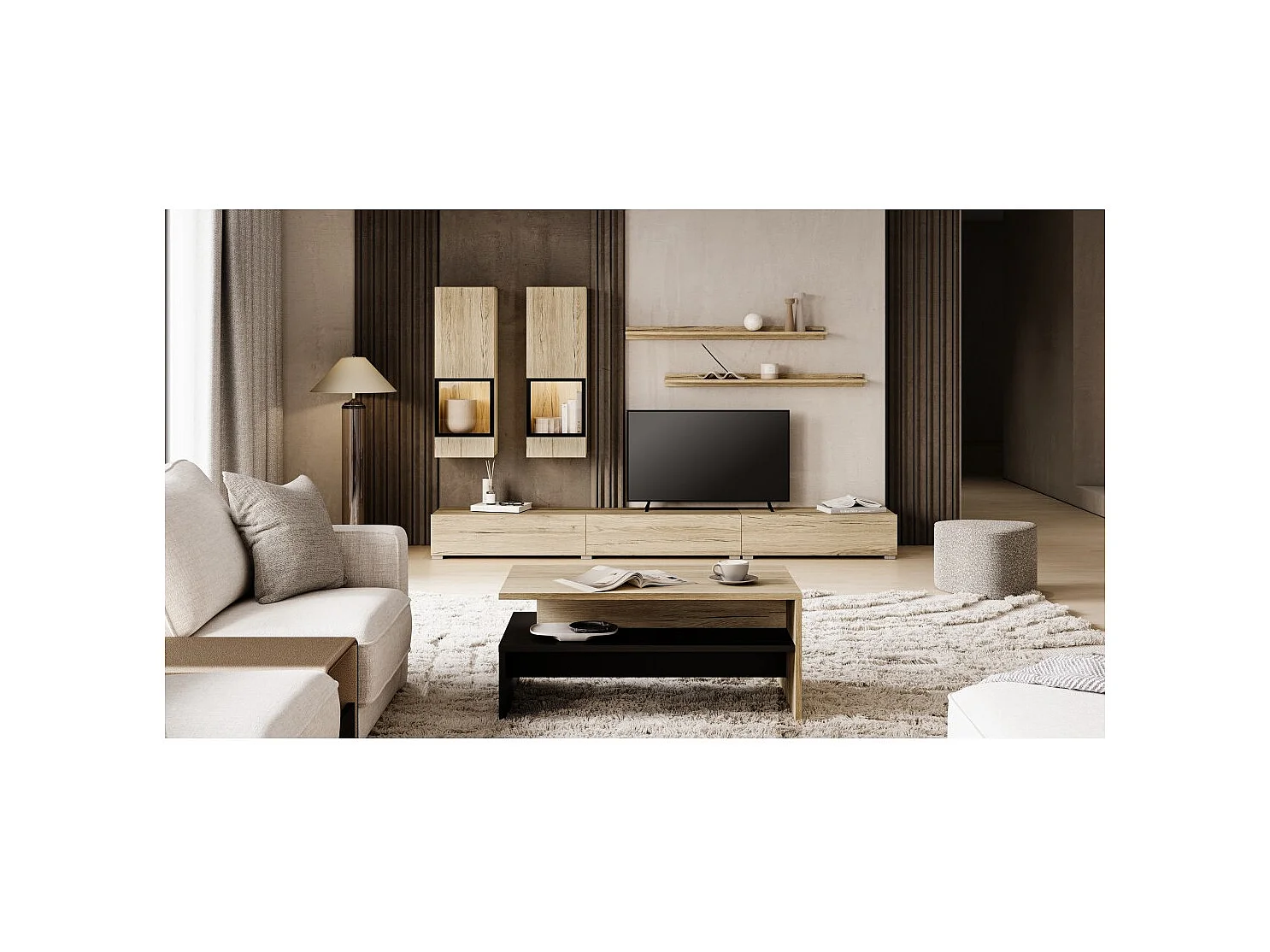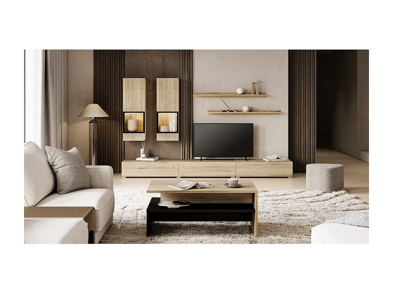 Ensemble salon RAMOS – LED multicolores intégrées – Chêne et noir - Meuble TV, vitrines, étagères