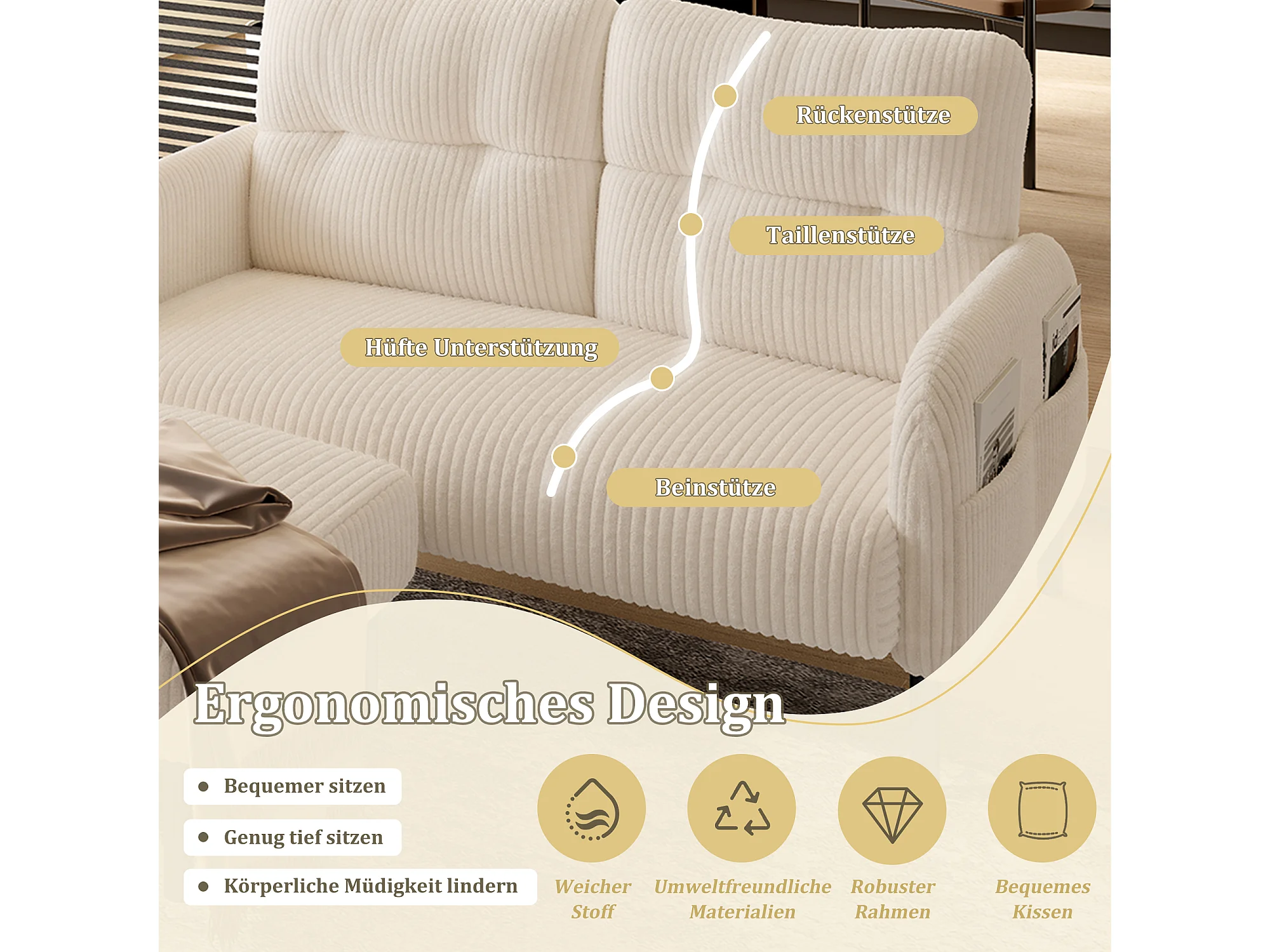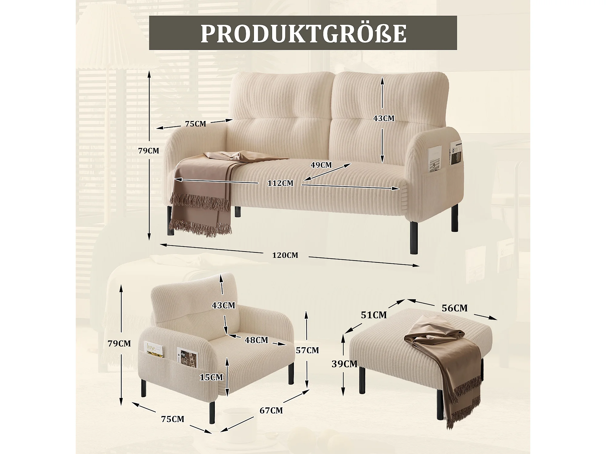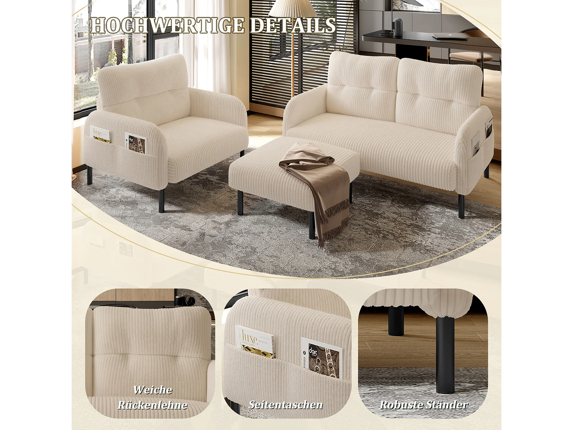 Ensemble 3 pièces velours beige – canapé 2 places et 3 places + pouf – coussins inclus – poches latérales – idéal pour salon, bureau et chambre