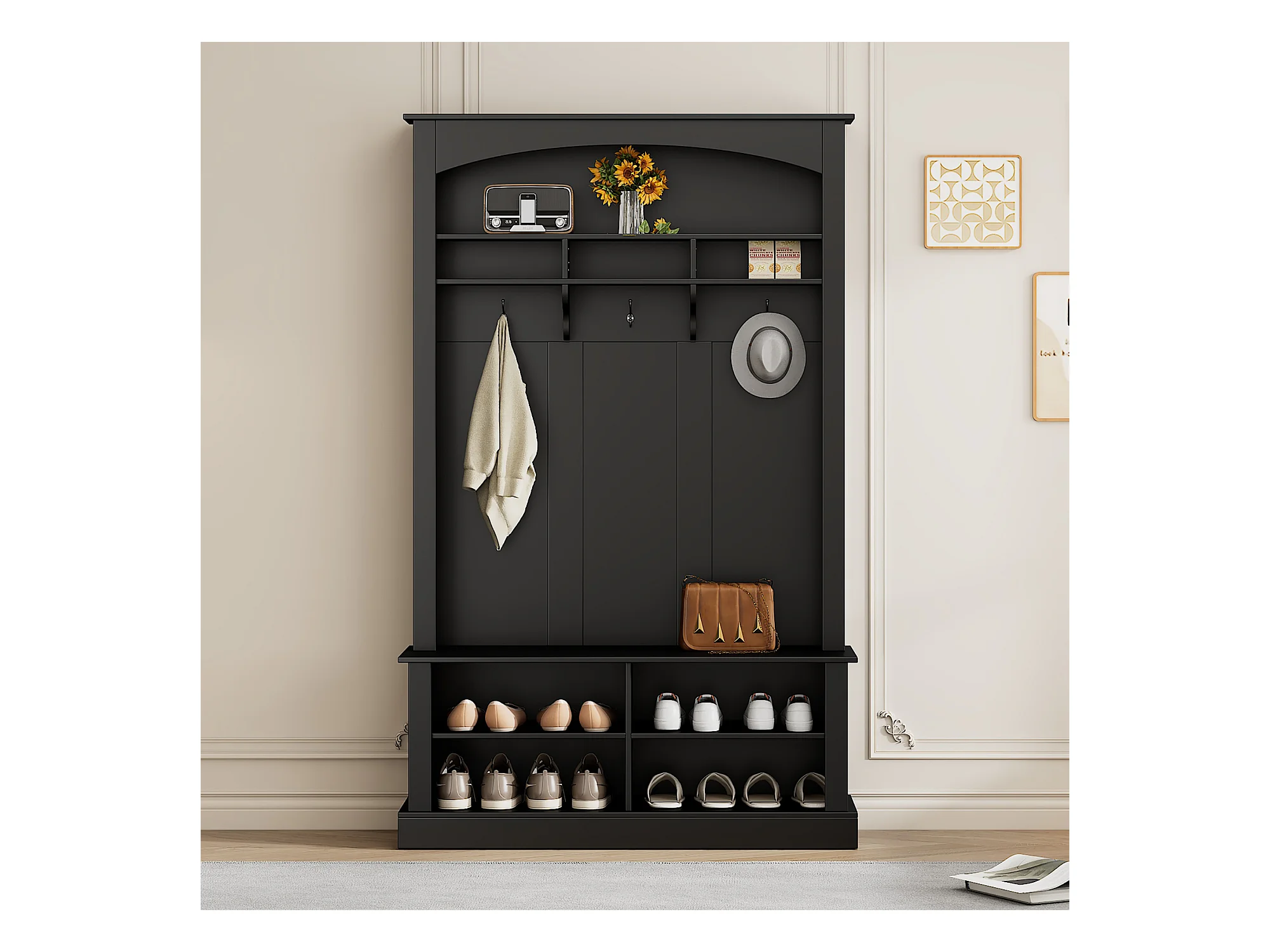 Porte-manteau avec banc à chaussures, 6 crochets triples, freestanding, design moderne, bois aggloméré, noir (120x40x191 cm)